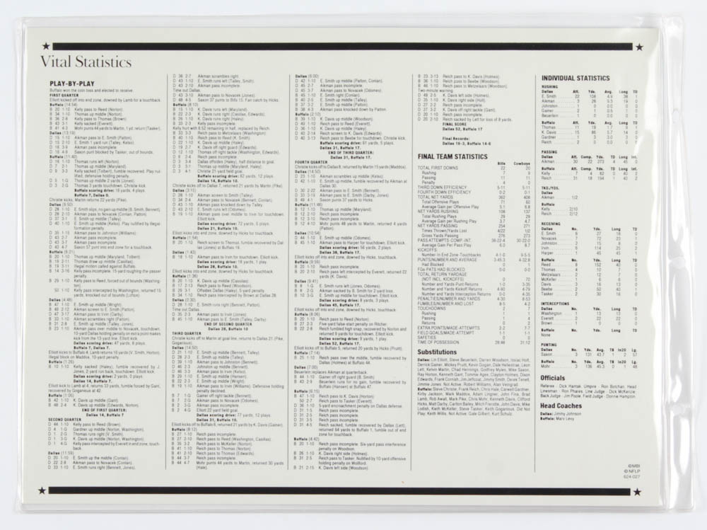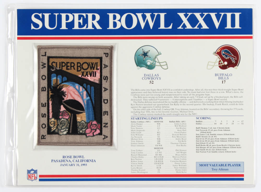 Super Bowl score card measures approximately 9.25" x 12" in size. Also includes a. Also includes a Super Bowl XXVII patch.