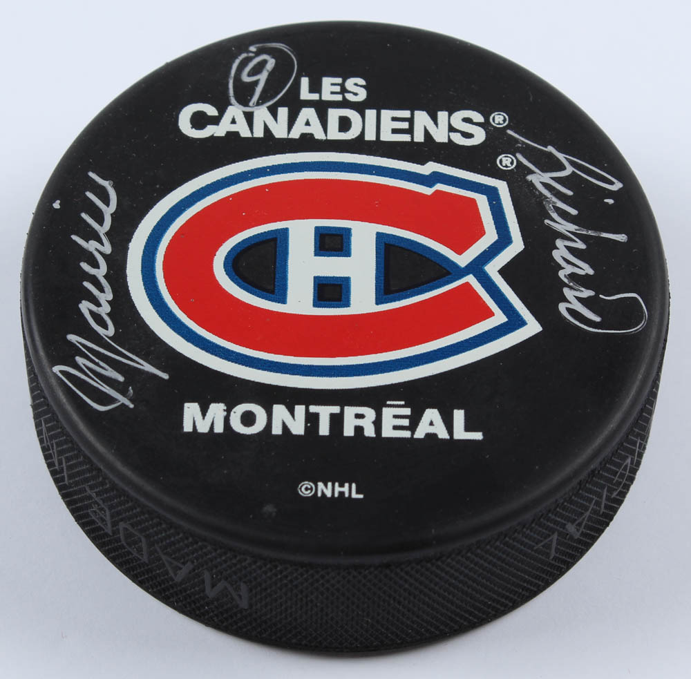 Montreal Canadiens logo hockey puck has been hand-signed by Maurice Richard (D. 2000, HOF).
