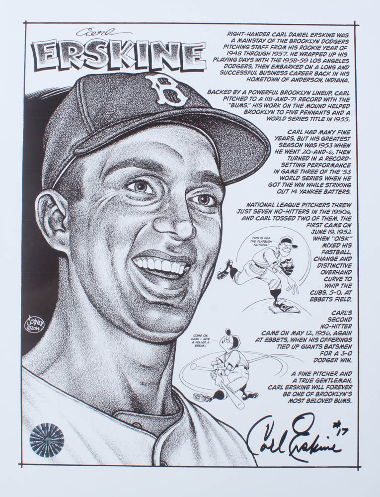 Photo measures 8" x 10" in size and has been hand-signed by Carl Erskine (Brooklyn Dodgers).