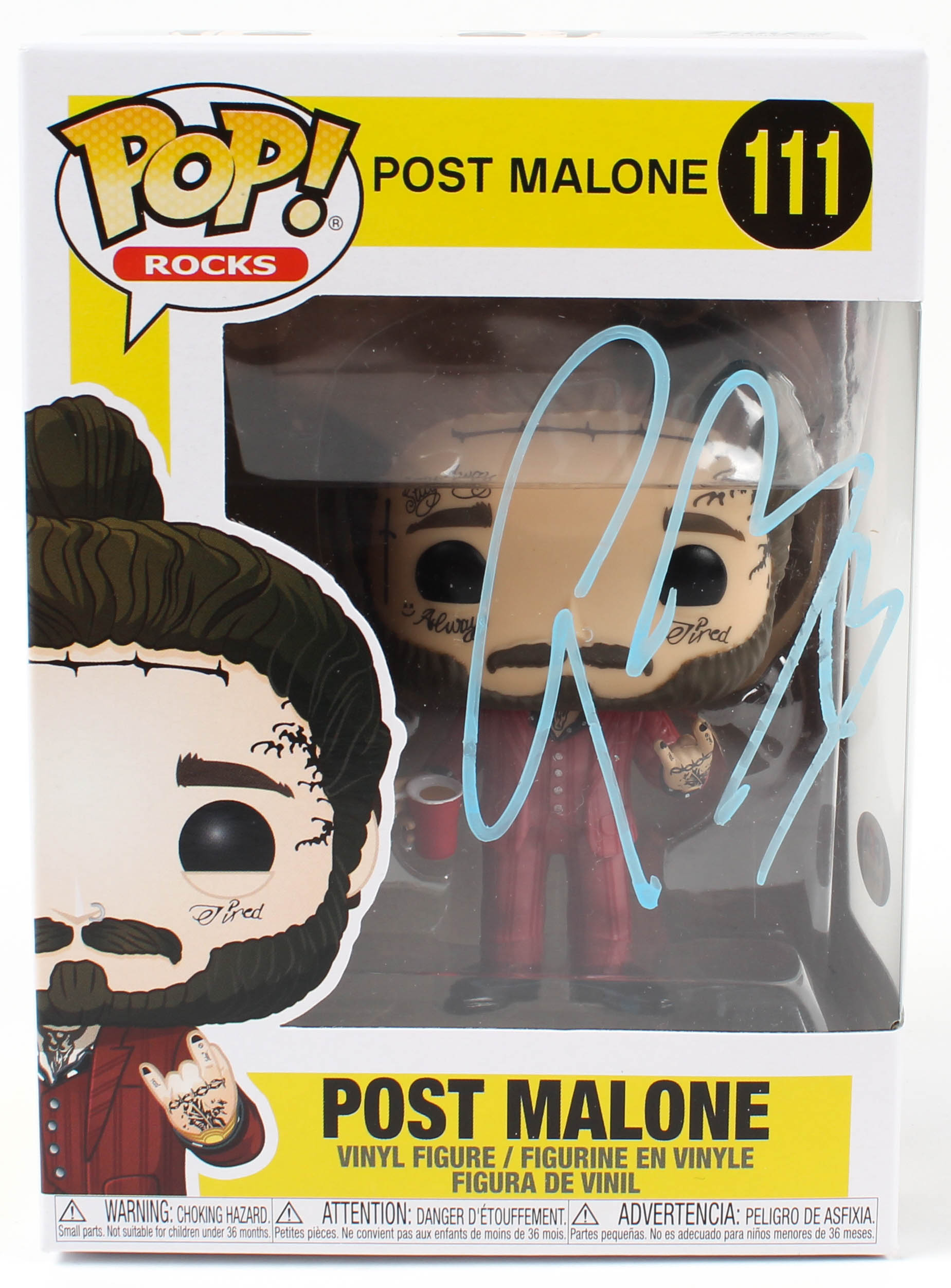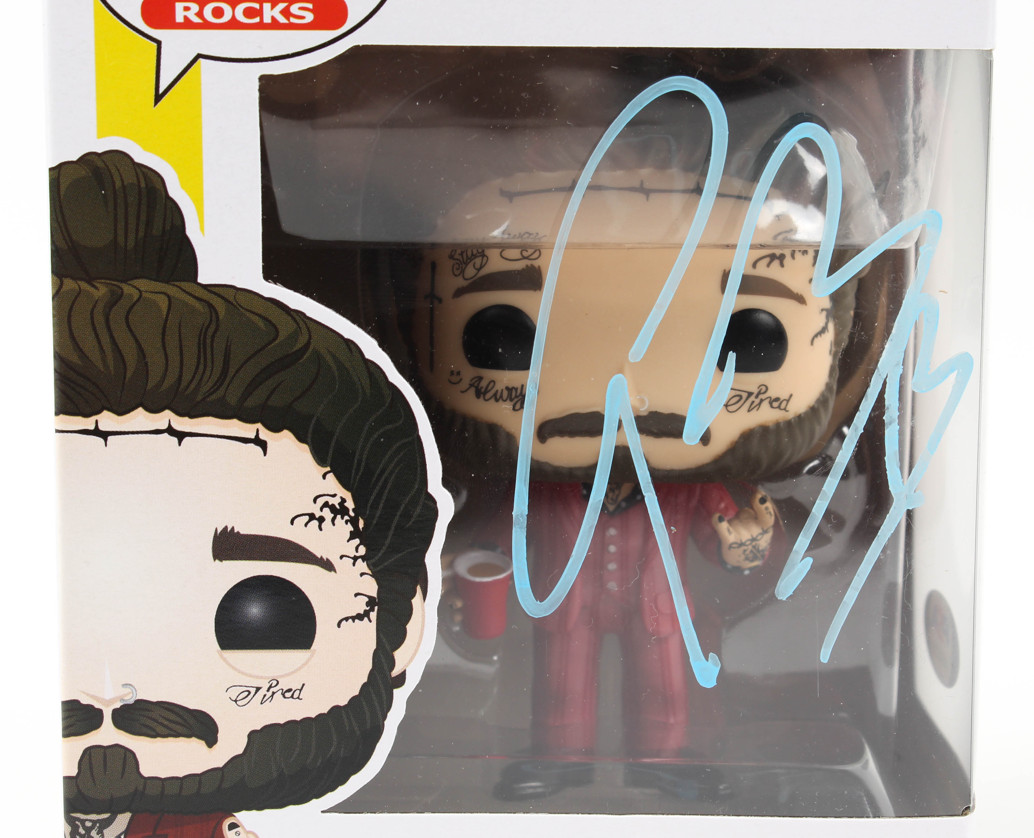 Funko Pop! vinyl figure measures approximately 4" tall and includes the original packaging as shown. Hand-signed by Post Malone.