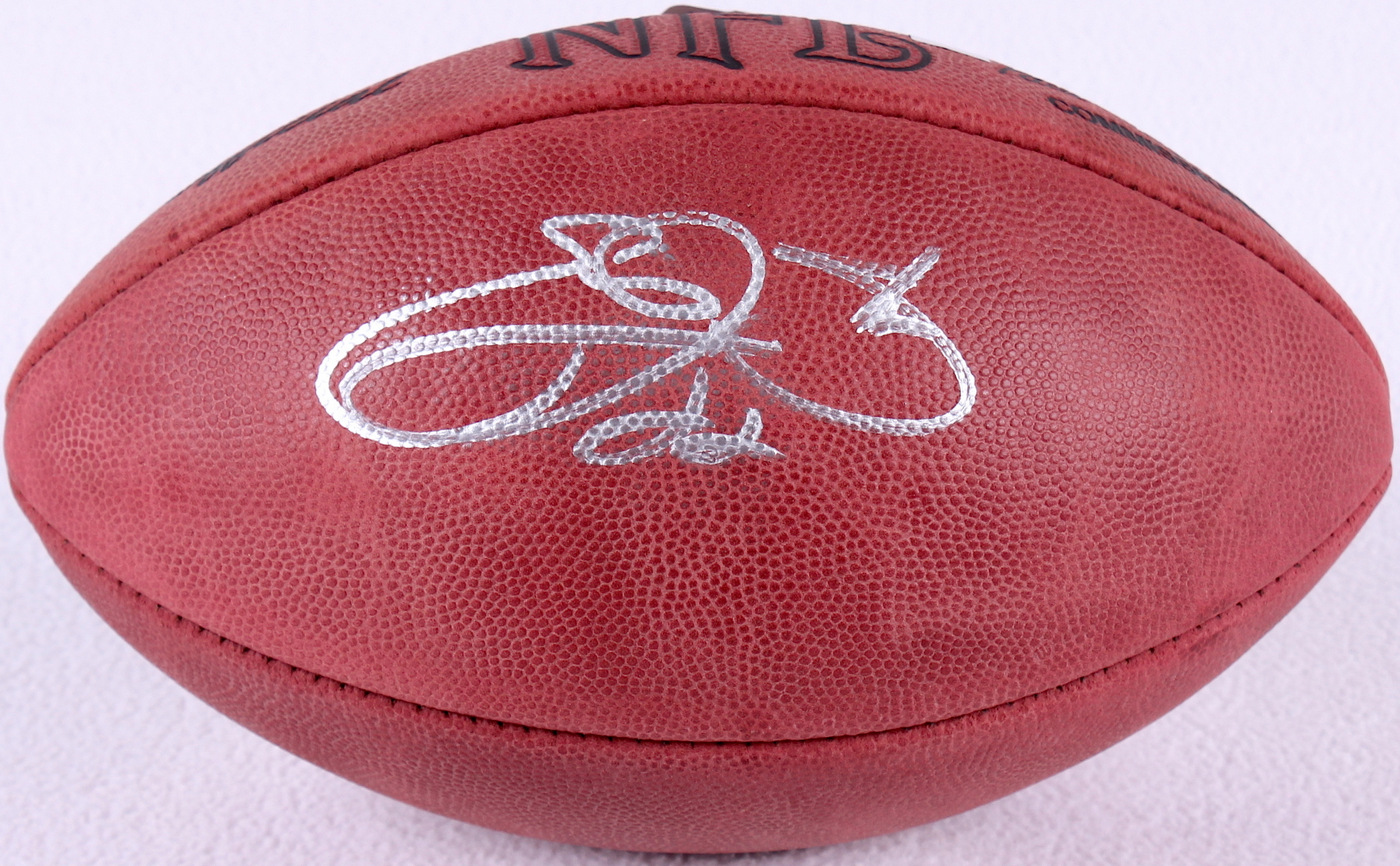 Wilson Official NFL Game Football. Hand-signed in silver paint pen by Emmitt Smith (Cowboys, HOF). The autograph includes an official Emmitt Smith hologram for authenticity purposes.