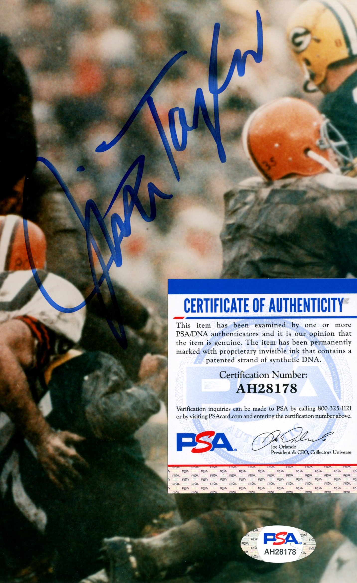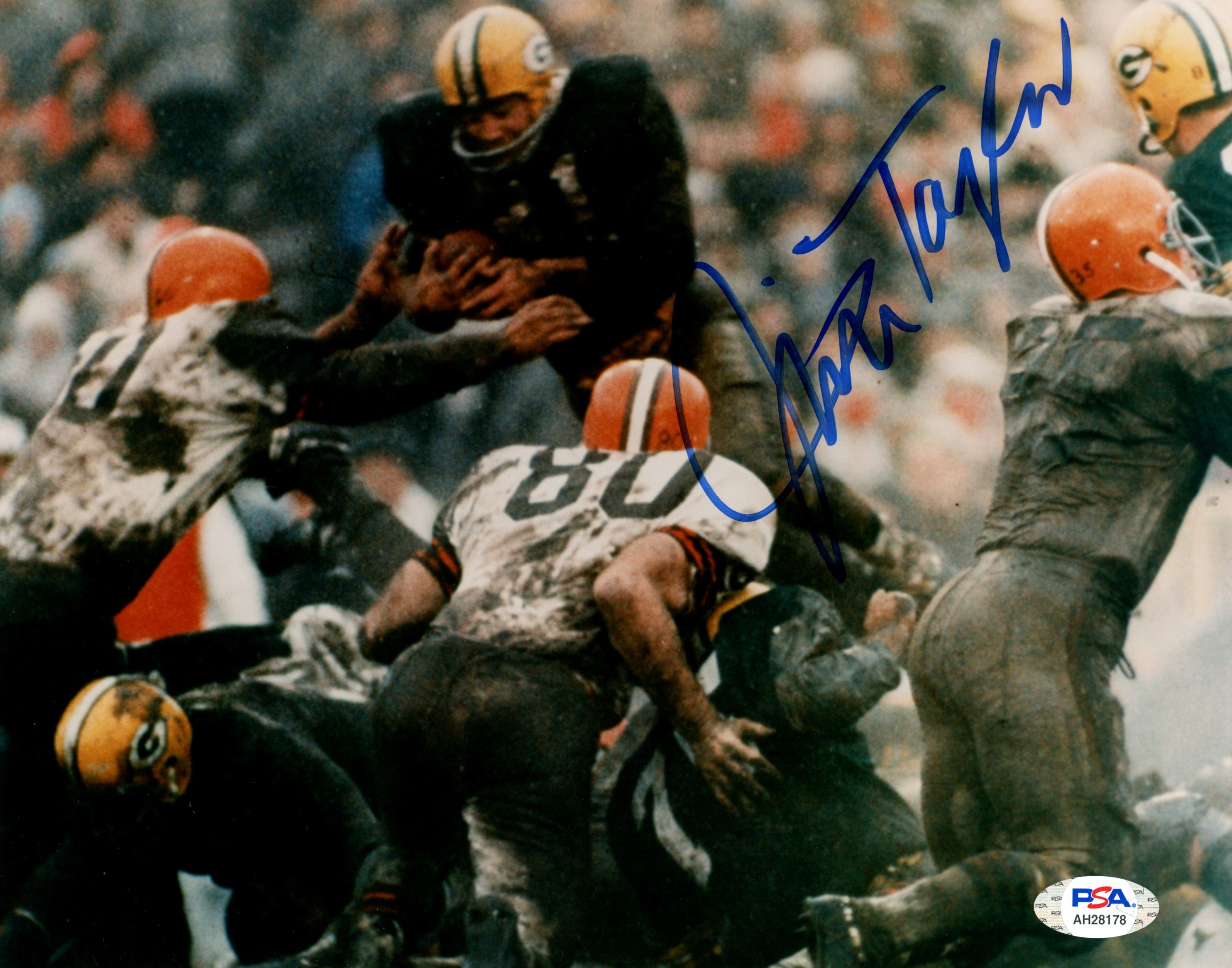 Photo measures 8" x 10" in size and has been hand signed by Jim Taylor (D. 2018, Green Bay Packers, HOF).