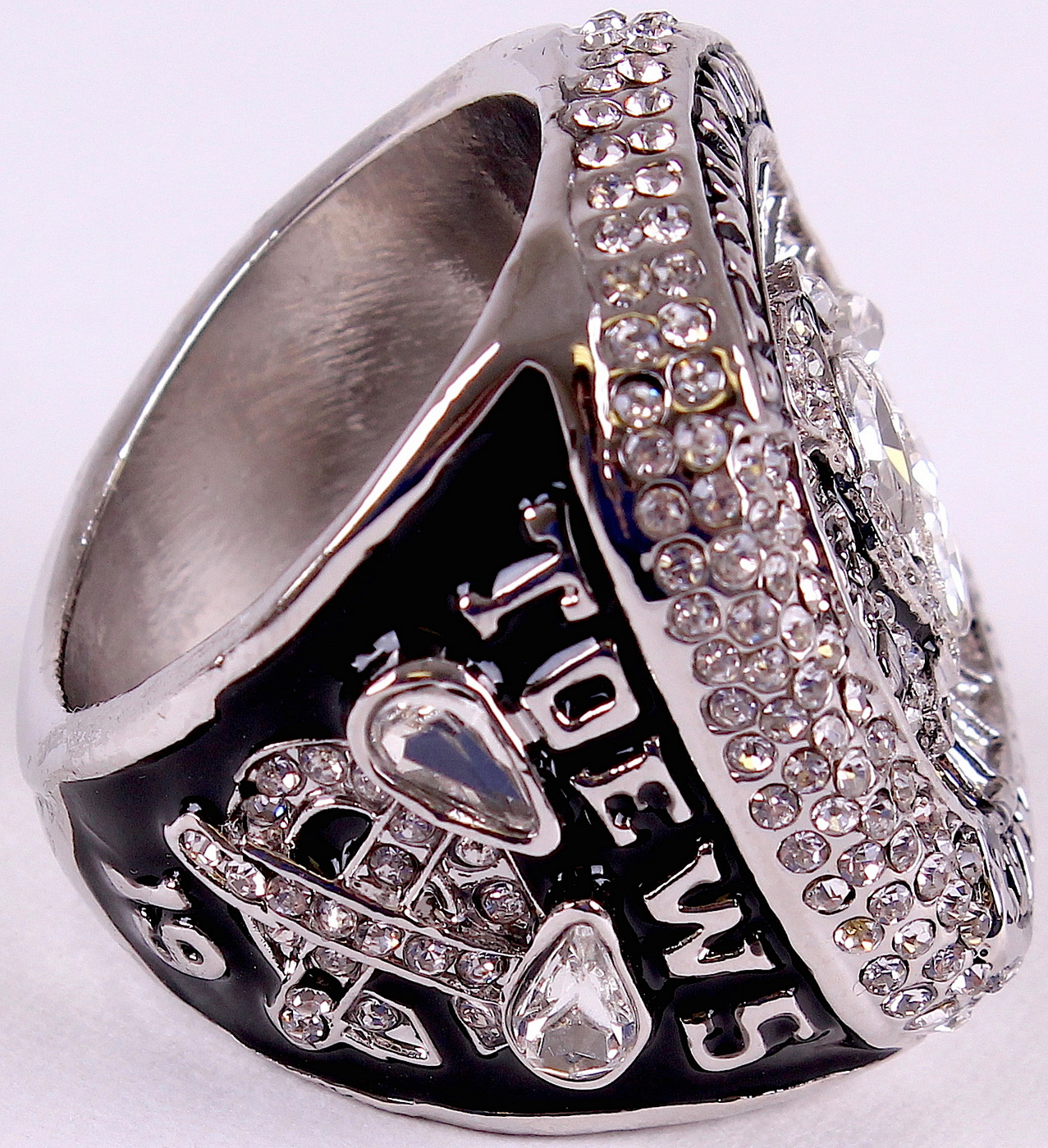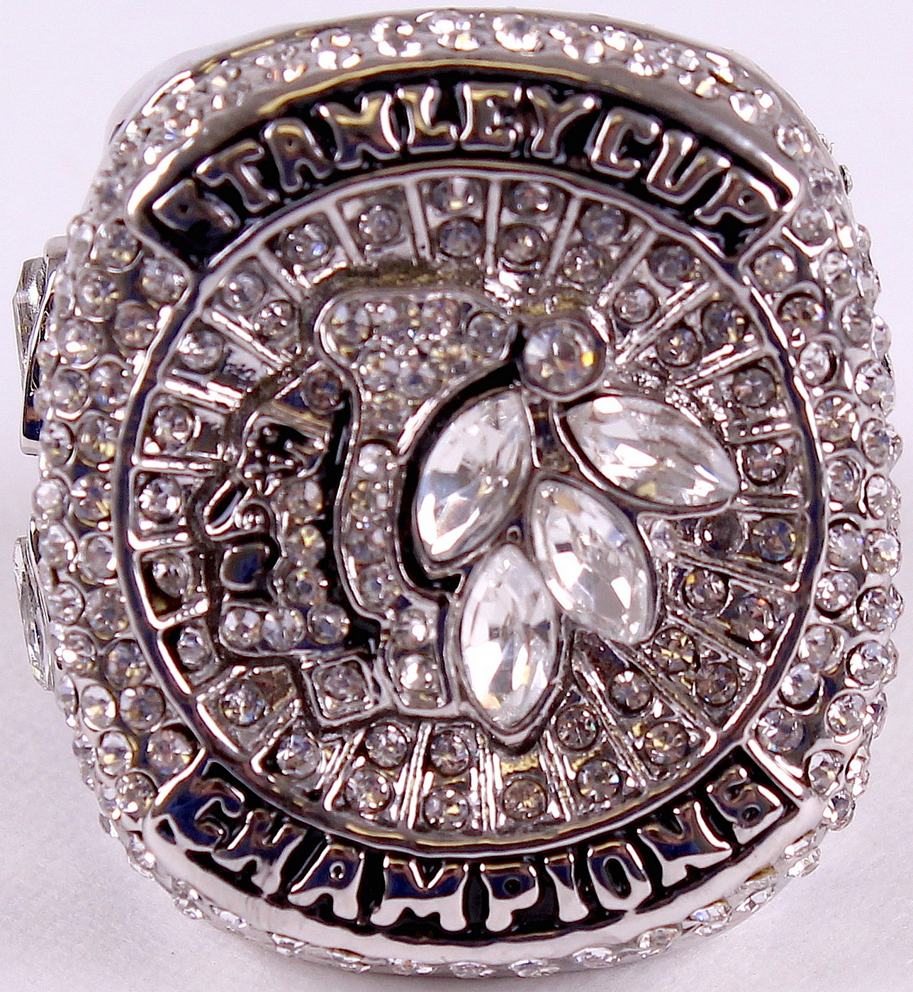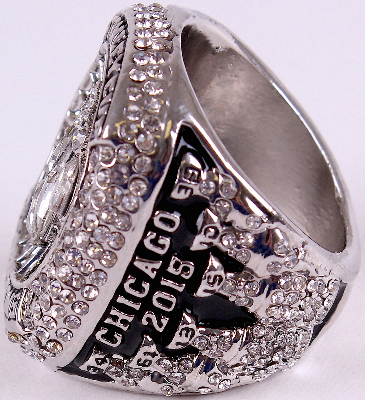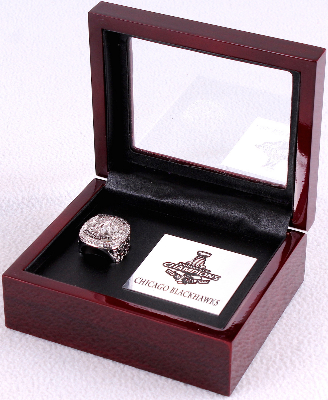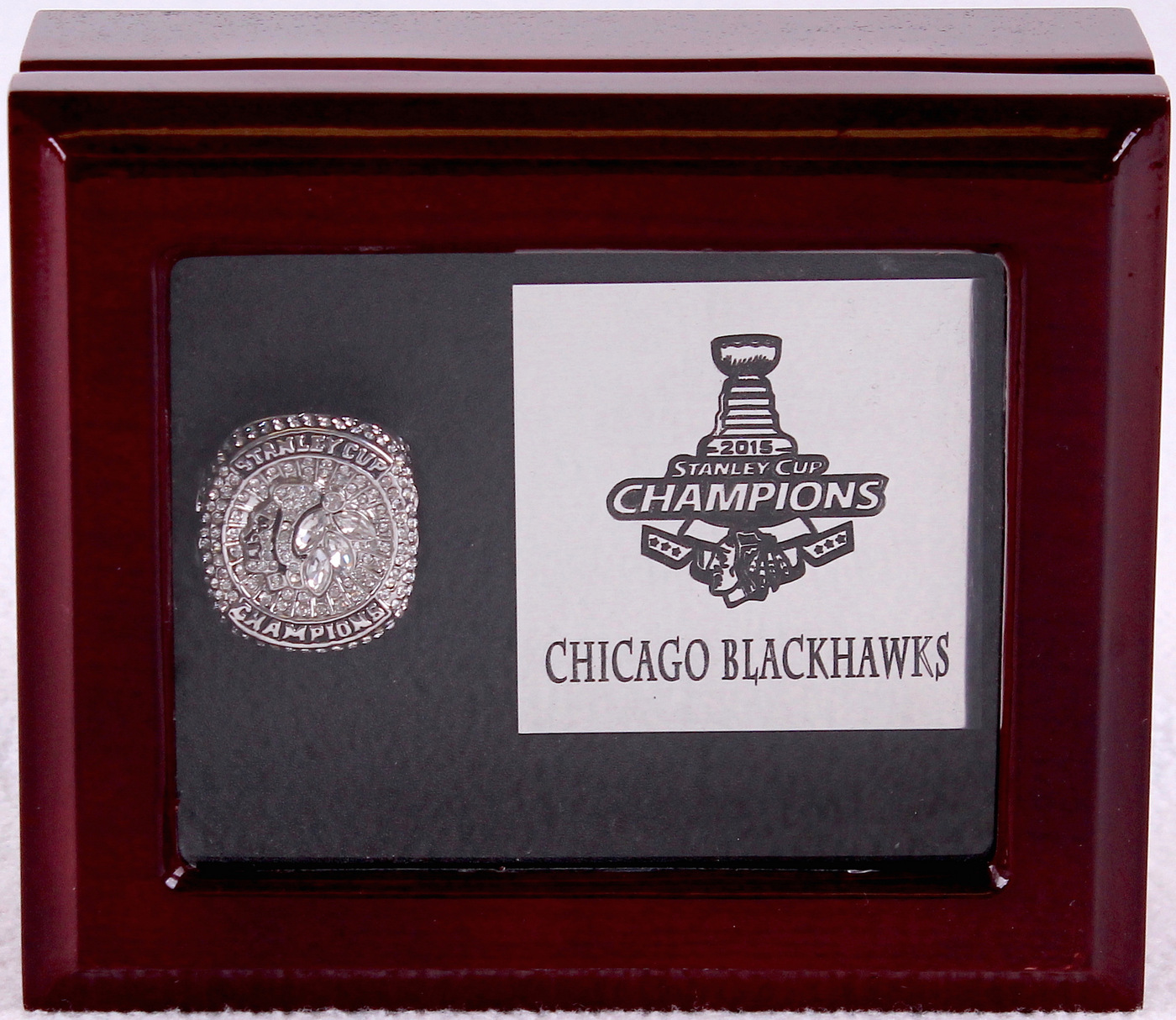 Jonathan Toews Chicago Blackhawks High Quality Replica 2015 Stanley Cup Championship Ring with piano lacquer wooden display case box. The case measures 5" x 6" x 2.5" in size. The ring has been hand crafted by professional jewelers. Made of .925 sterling silver plated over alloy with high grade AAA grade Cubic Zirconium (CZ) stones and Austrian crystals. Size 11.