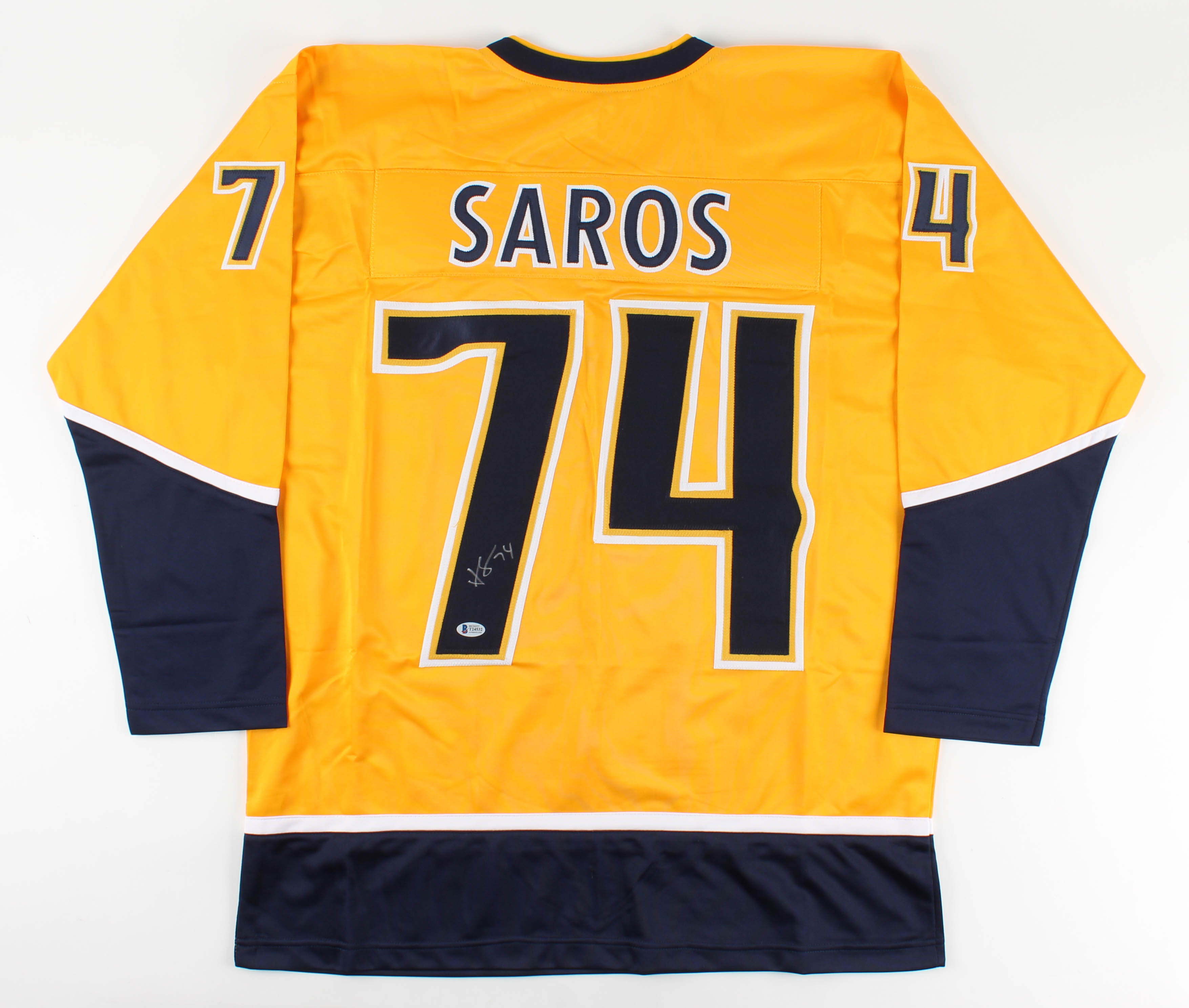 Custom on-ice style jersey. Everything is sewn on, size XL. Has been hand-signed by Juuse Saros.