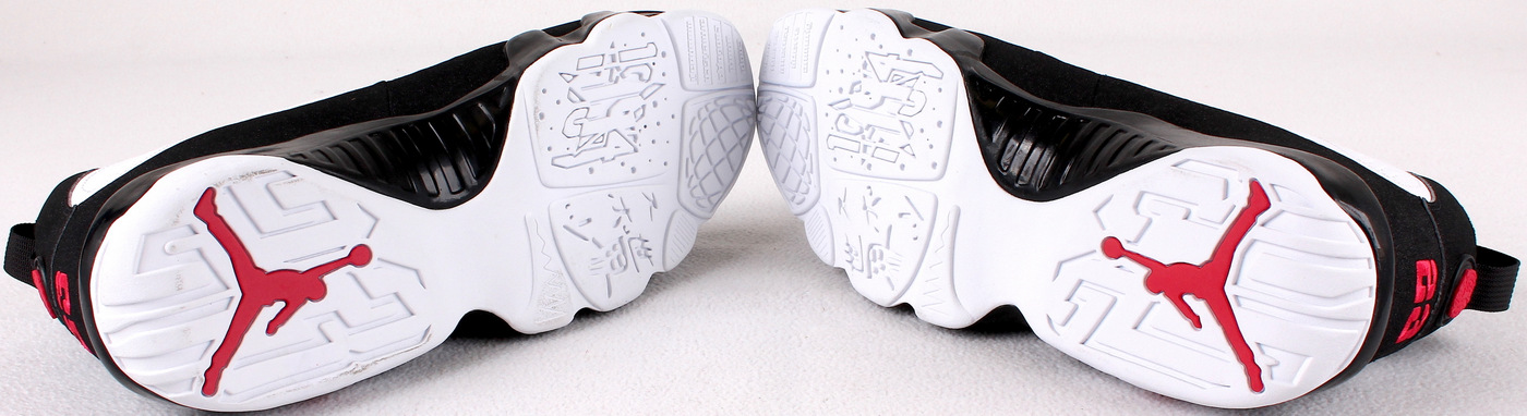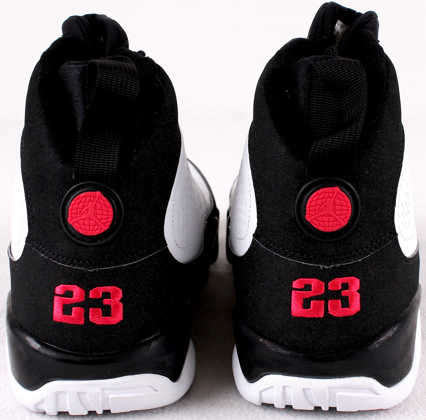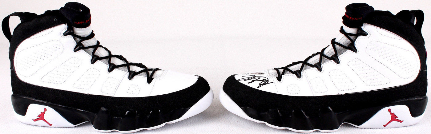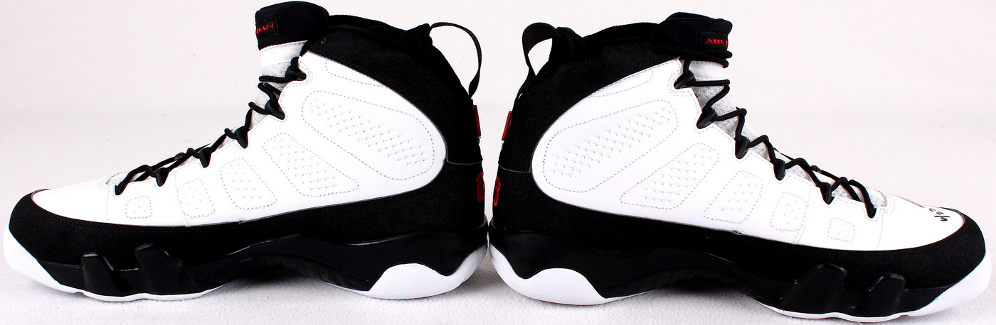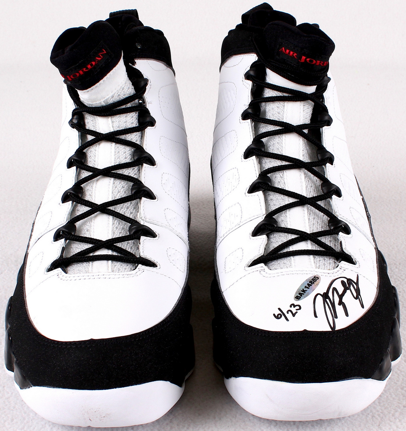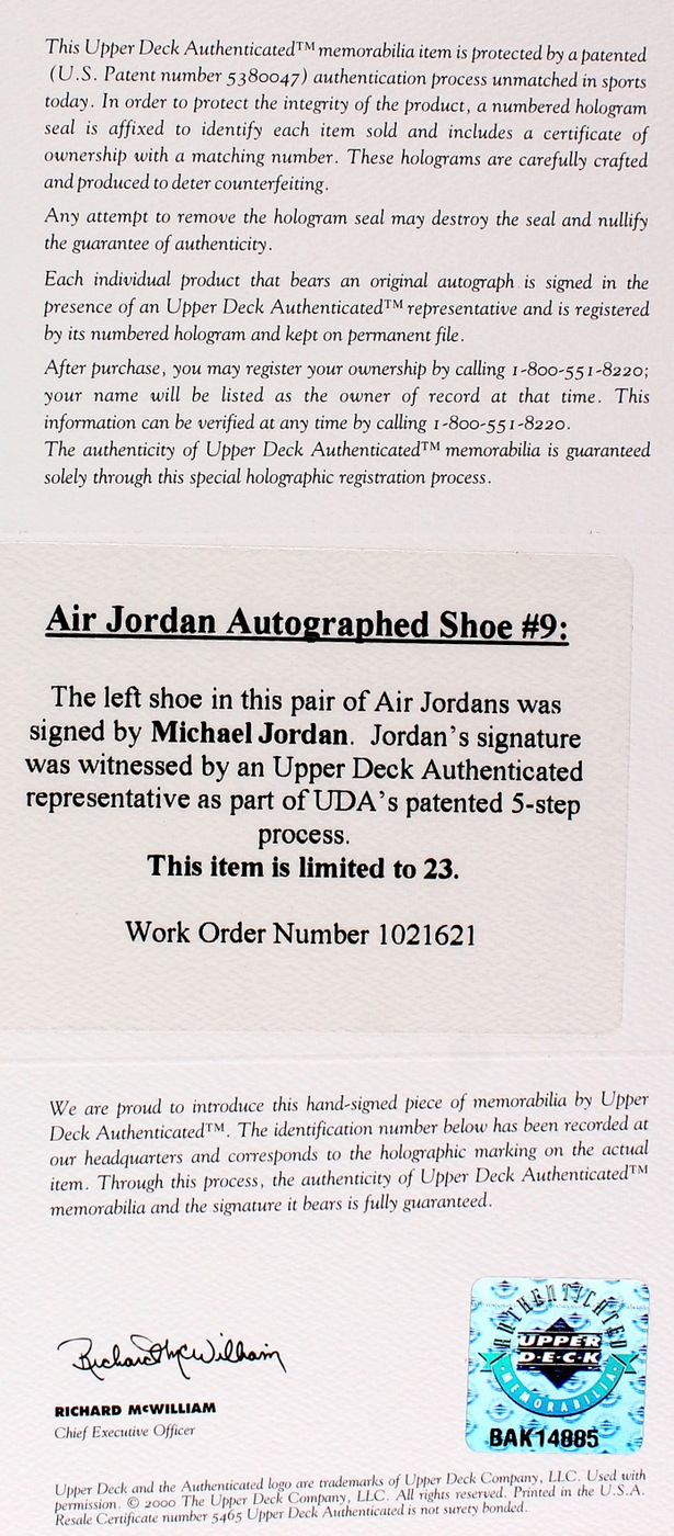 New pair of "Air Jordan" Retro 9 basketball shoes, size 13. The left shoe is hand-signed in black felt-tip pen by Michael Jordan (Bulls HOF). Limited Edition numbered #6/23. The autograph includes an official Upper Deck Authenticated (UDA) hologram and matching COA for authenticity purposes.