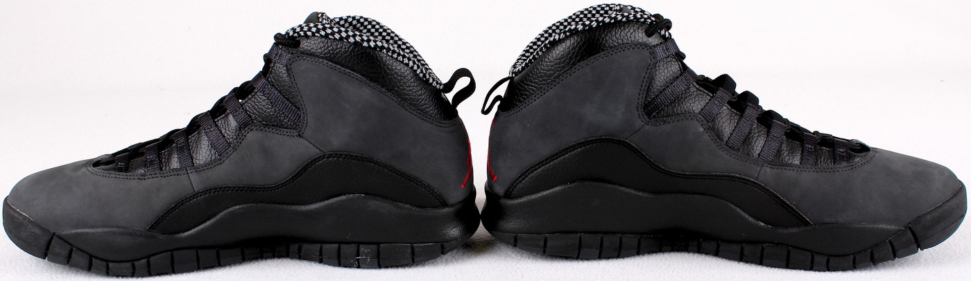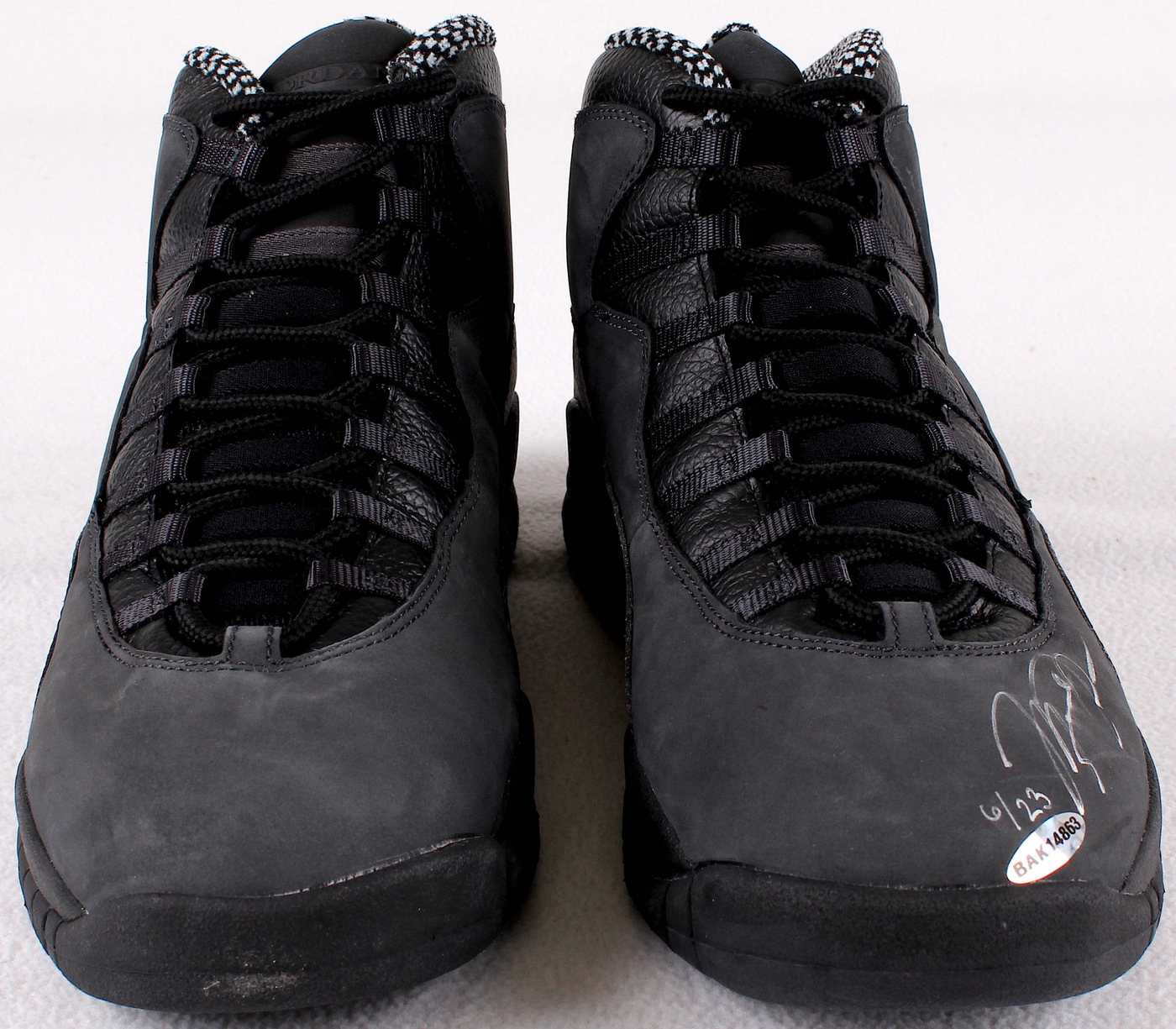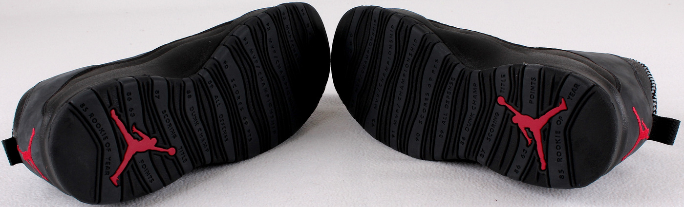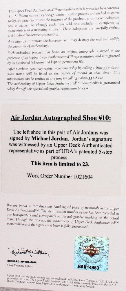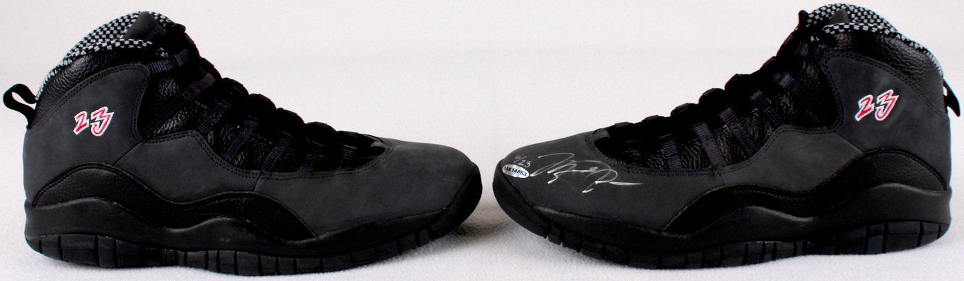 New pair of "Air Jordan" Retro 10 basketball shoes, size 13. The left shoe is hand-signed in silver paint pen by Michael Jordan (Bulls HOF). Limited Edition numbered #6/23. The autograph includes an official Upper Deck Authenticated (UDA) hologram and matching COA for authenticity purposes.