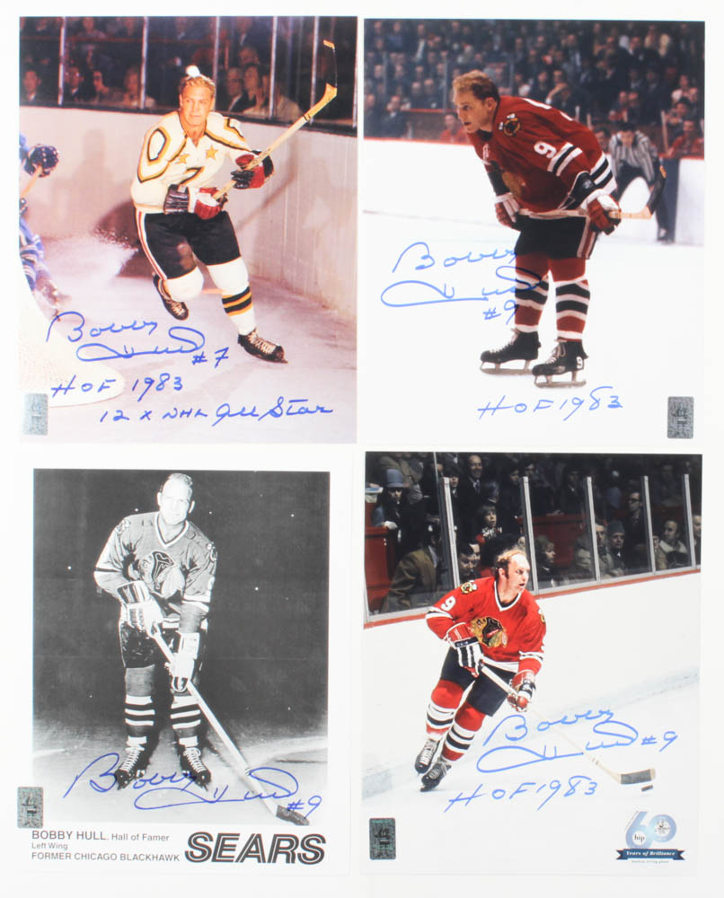 Lot includes all (4) photos shown. Photos measure 8" x 10" in size and have been hand-signed by Bobby Hull (Chicago Blackhawks, HOF).