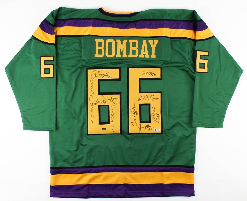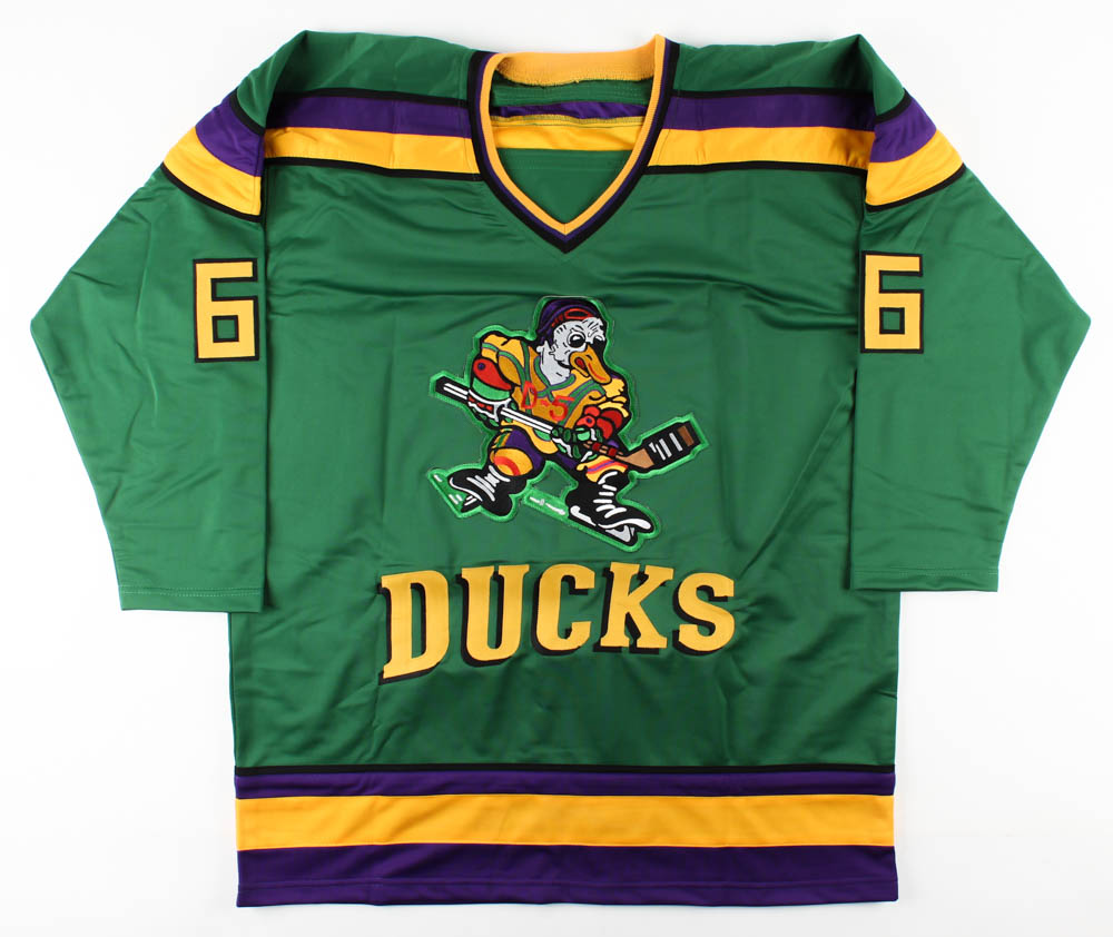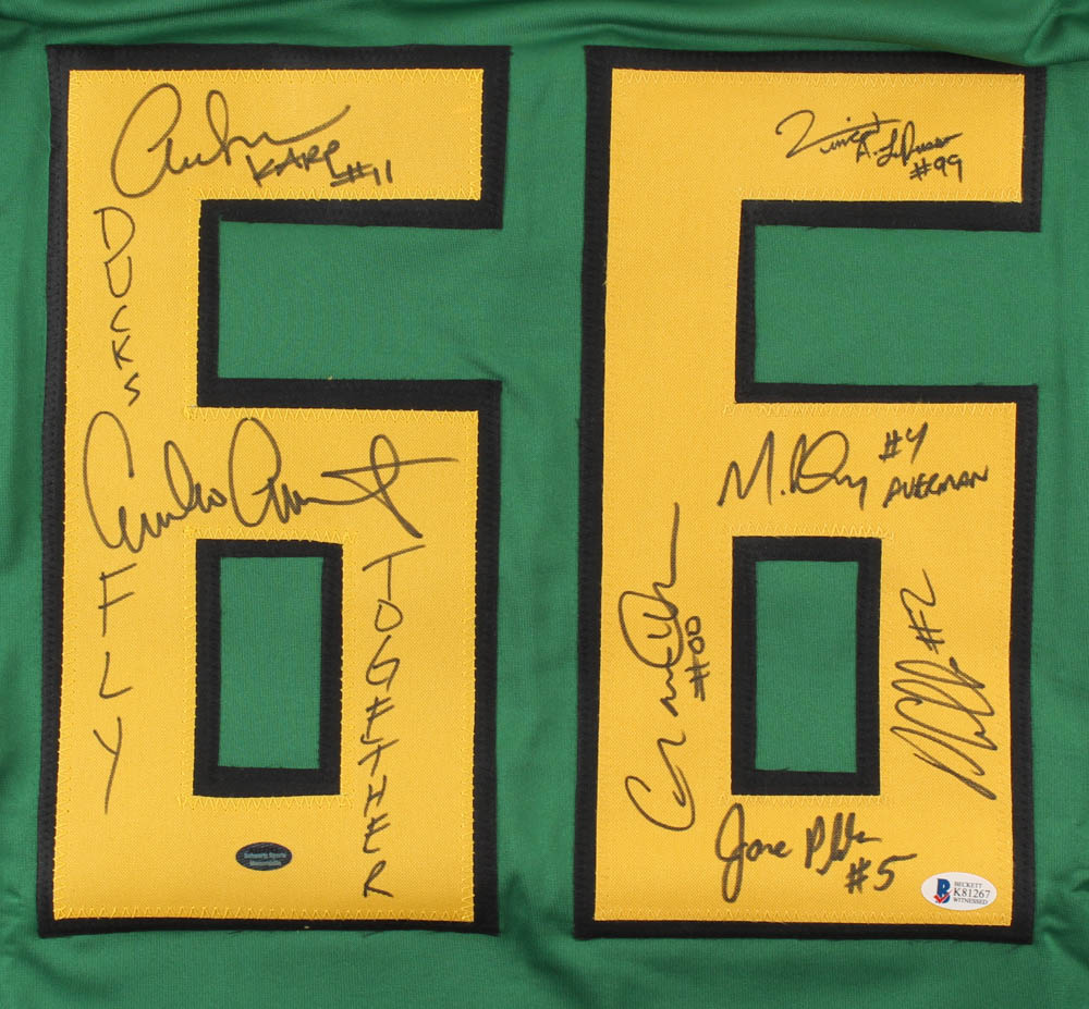 Custom on-ice style jersey. Everything is sewn on, size XL. Has been hand-signed and inscribed by (6) including Matt Doherty (Lester Averman), Jane Plank (Tammy Duncan), Vincent LaRusso (Adam Banks), Danny Tamberelli (Tommy Duncan), Aaron Schwartz (Dave Karp), and Garette Ratliff Henson (Guy Germaine).