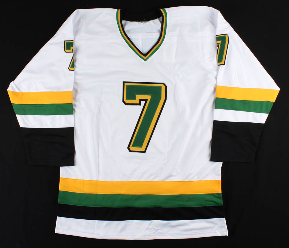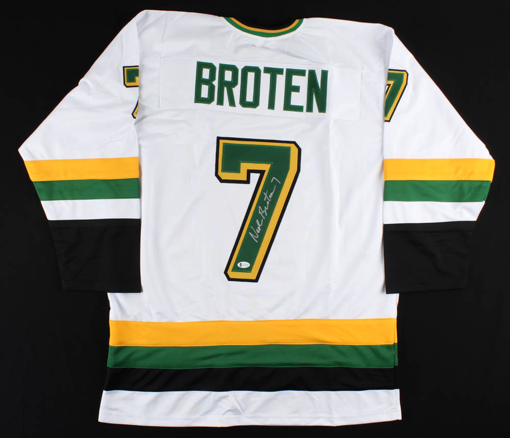Custom on-ice style jersey. Everything is sewn on, size XL. Hand-signed by Neal Broten (HOF).