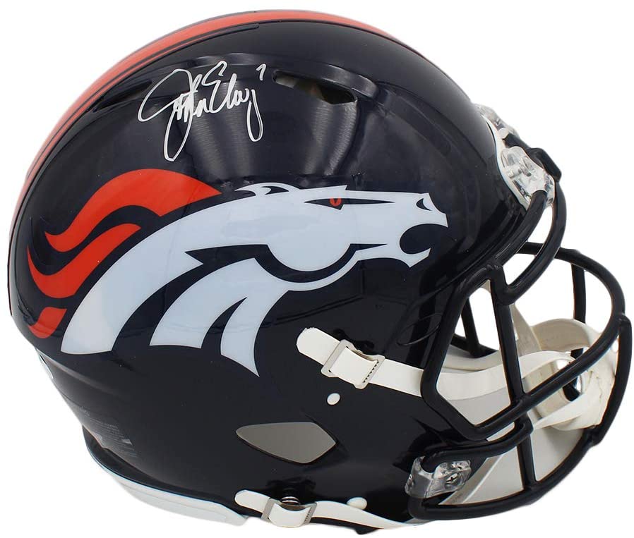 Riddell Denver Broncos full-size authentic on-field speed helmet. Hand-signed by John Elway (HOF).