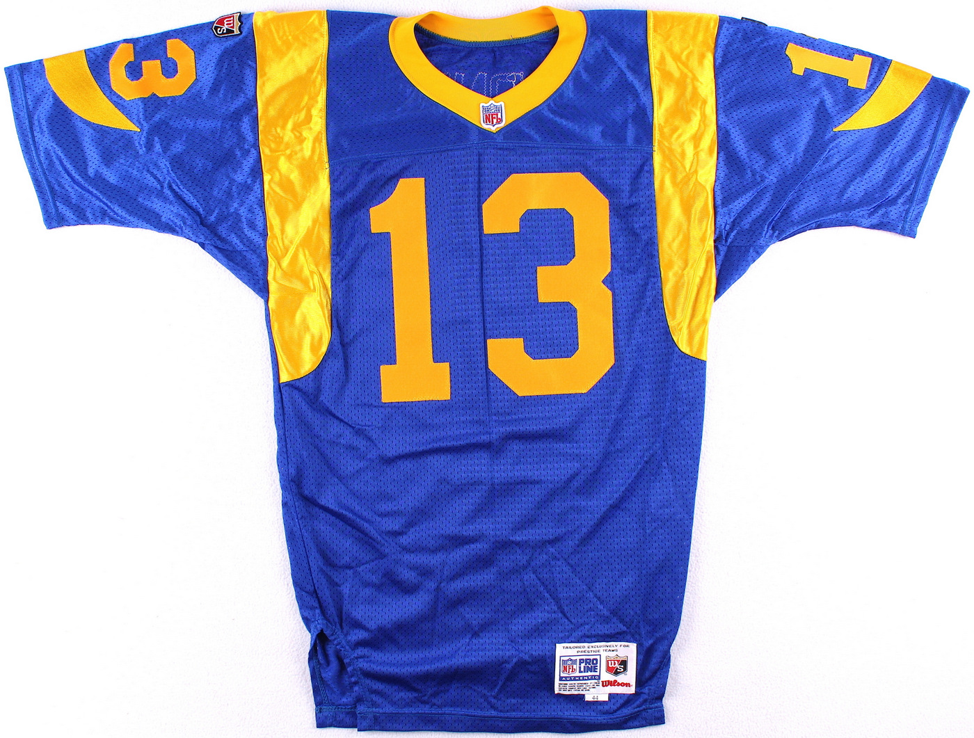 Wilson on-field style jersey. Everything sewn on, size 44. Hand-signed and inscribed in black felt-tip pen by Kurt Warner (Rams, Cardinals). The autograph includes an official Kurt Warner player hologram for authenticity purposes.
