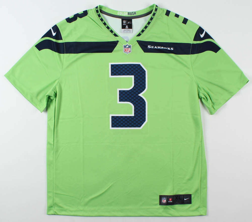 Nike on-field style jersey. Everything is printed on, size XL. Hand-signed by Russell Wilson (Seattle Seahawks).