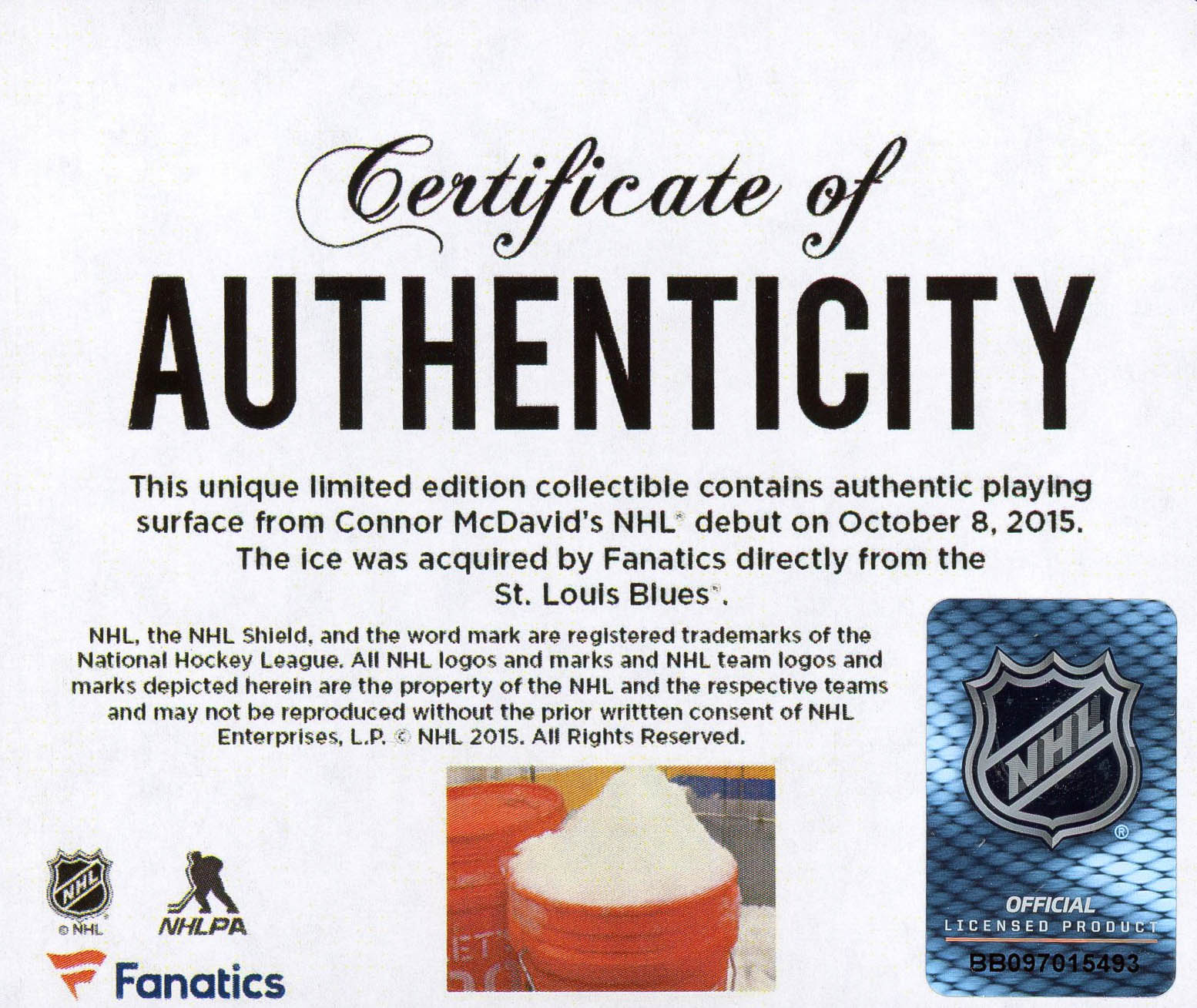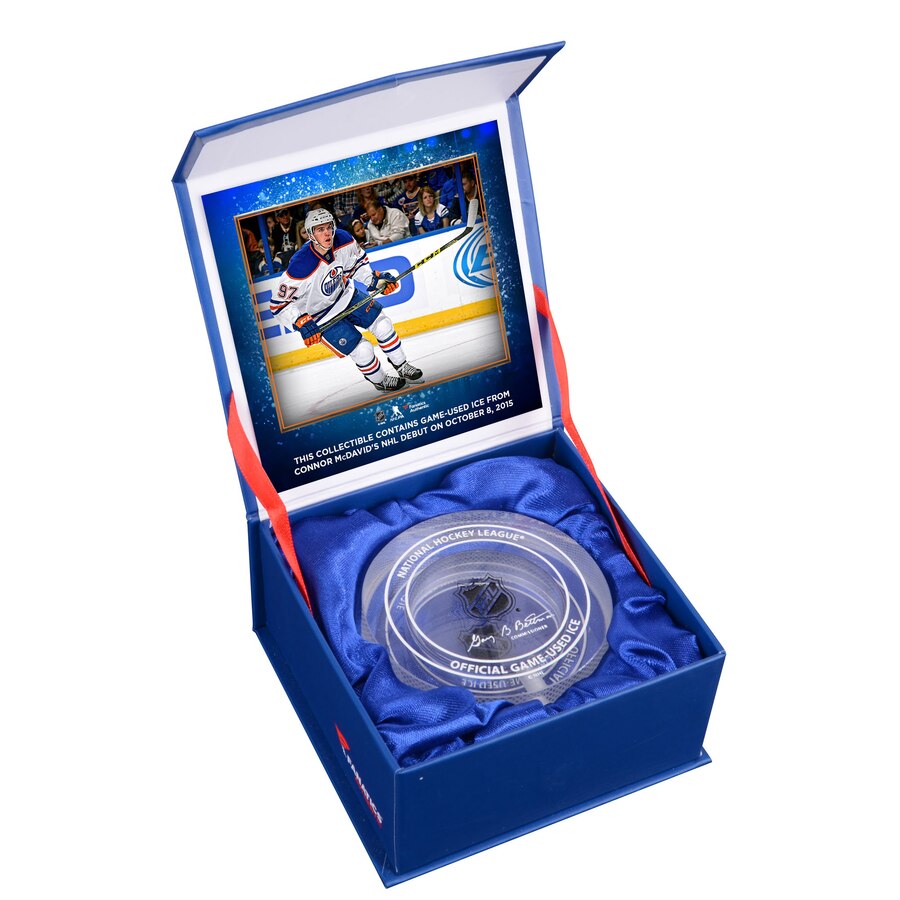 Commemorate Connor McDavid's NHL Debut with this crystal puck. Each puck comes filled with melted game-used ice from Connor McDavid's NHL Debut game on October 8th, 2015, and is shipped in a Fanatics Authentic gift box. It is officially licensed by the National Hockey League and comes with a certificate of authenticity.