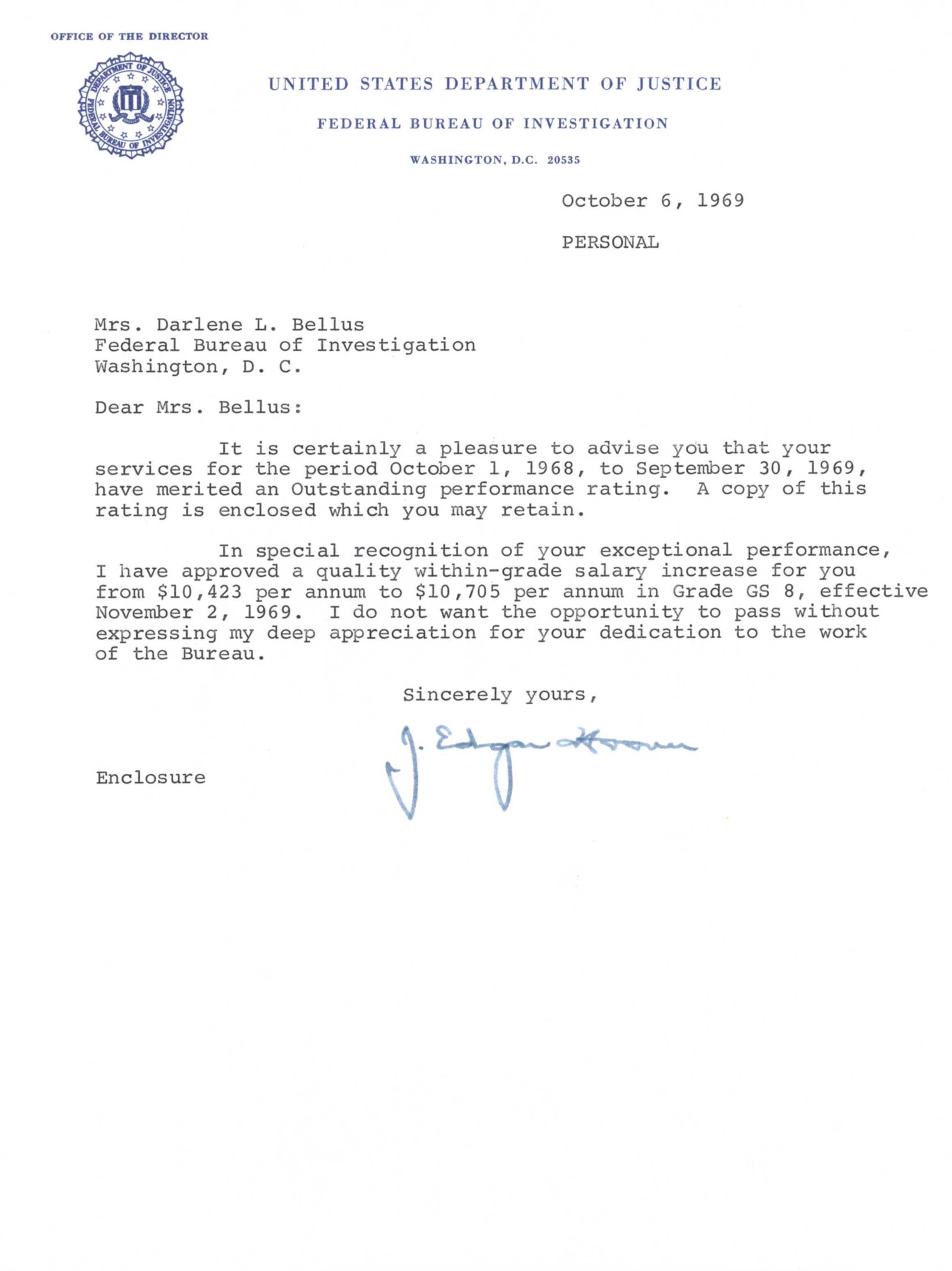 Letter measures 8" x 10" in size and has been hand-signed by J. Edgar Hoover (D. 1972).