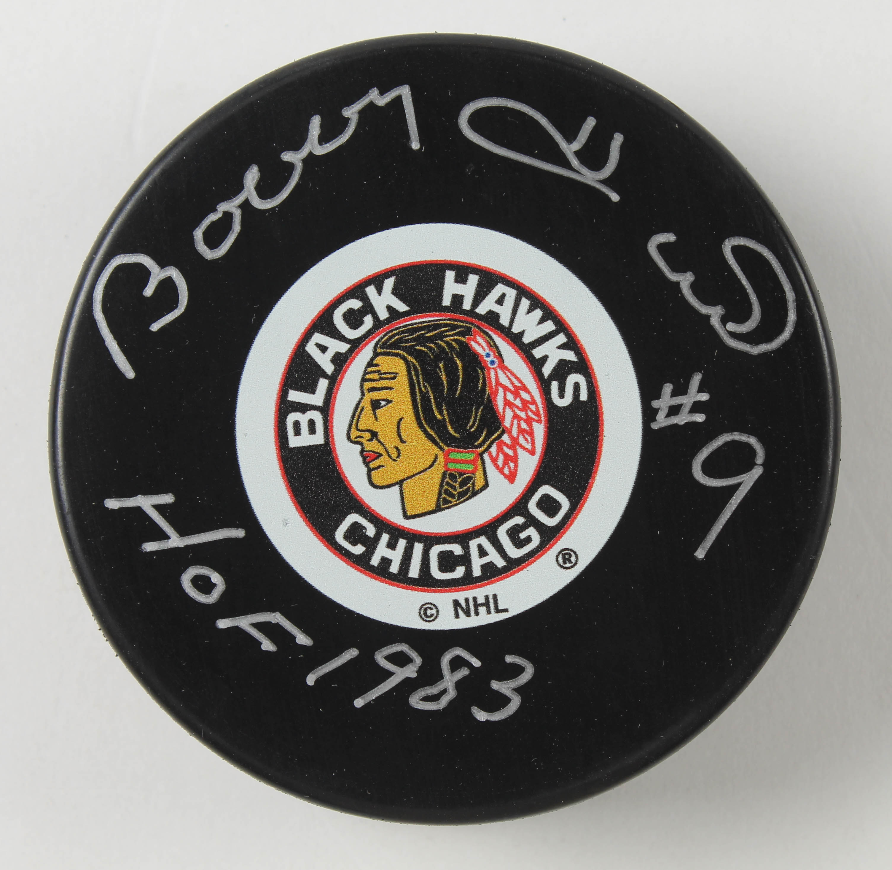 Chicago Blackhawks Logo Hockey Puck has been hand-signed and inscribed by Bobby Hull (HOF).