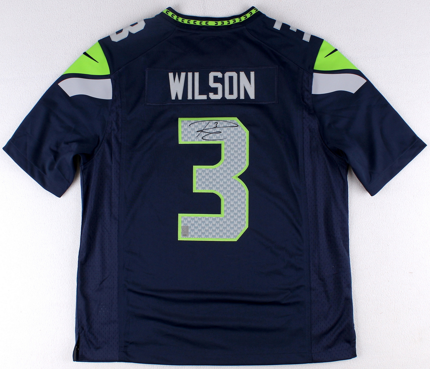 Nike jersey, size XL. Jersey is new with tags. Hand-signed in black felt tip pen by Russell Wilson. The autograph includes an official Russell Wilson hologram and matching COA from Mill Creek Sports for authenticity purposes.