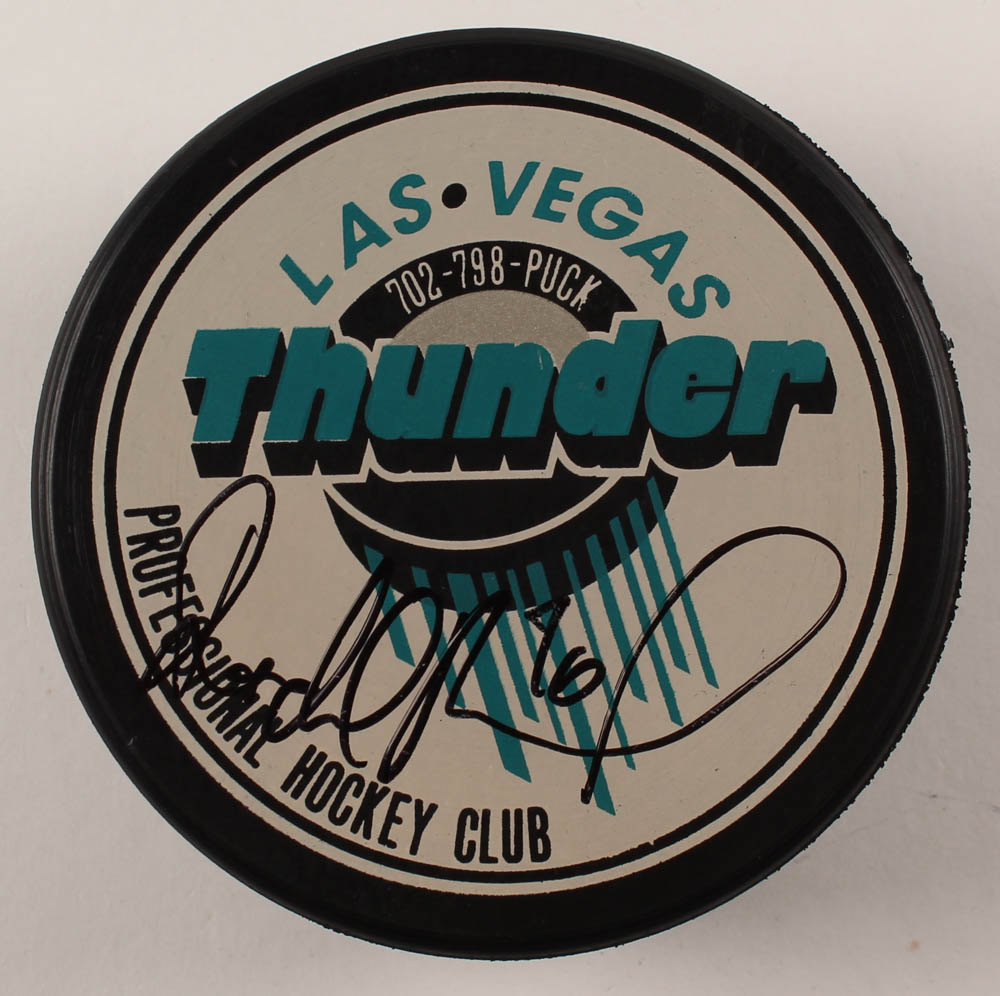 Las Vegas Thunder logo hockey puck hand-signed by Radek Bonk.