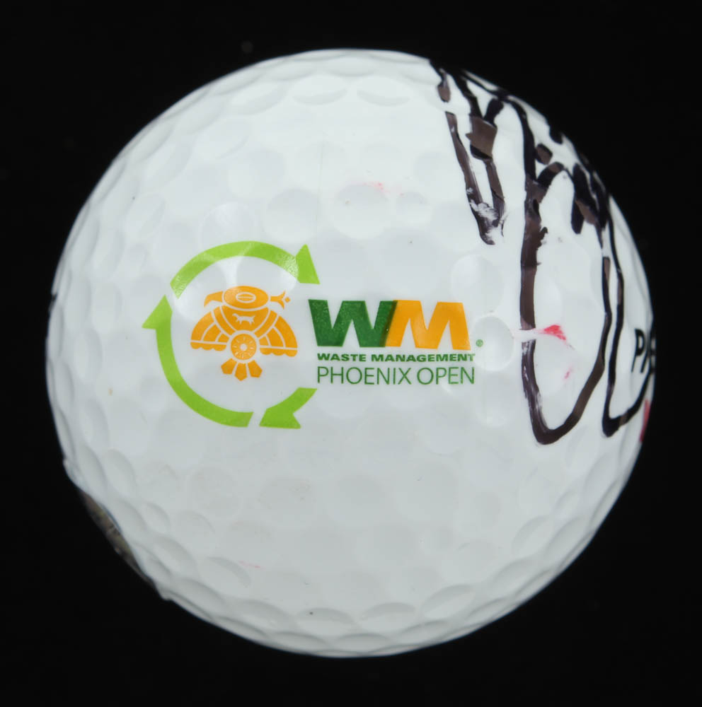 Waste Management Phoenix Open logo golf ball has been hand-signed by Rickie Fowler.