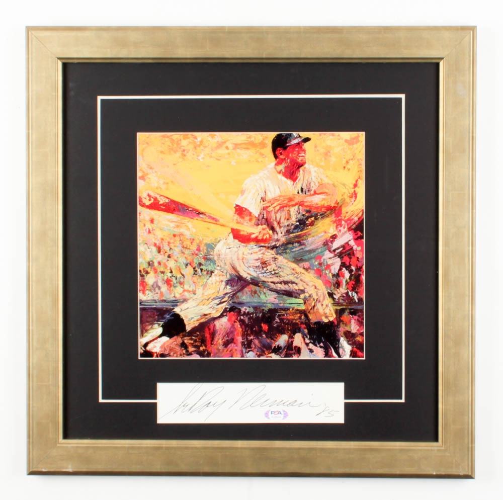 Custom frame measures approximately 18.5" x 18.5" in size and features a cut that has been hand-signed by LeRoy Neiman (D. 2012). Display also features a print of Neiman's "Mickey Mantle".