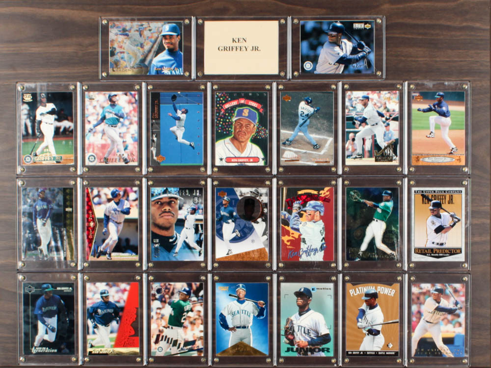 Custom plaque display measures 18" x 24" in size and features (23) Ken Griffey Jr. baseball cards. The cards have been encased in acrylic and attached to the wooden plaque. Please note, the display is unsigned. Please see images for details regarding the condition of the plaque.