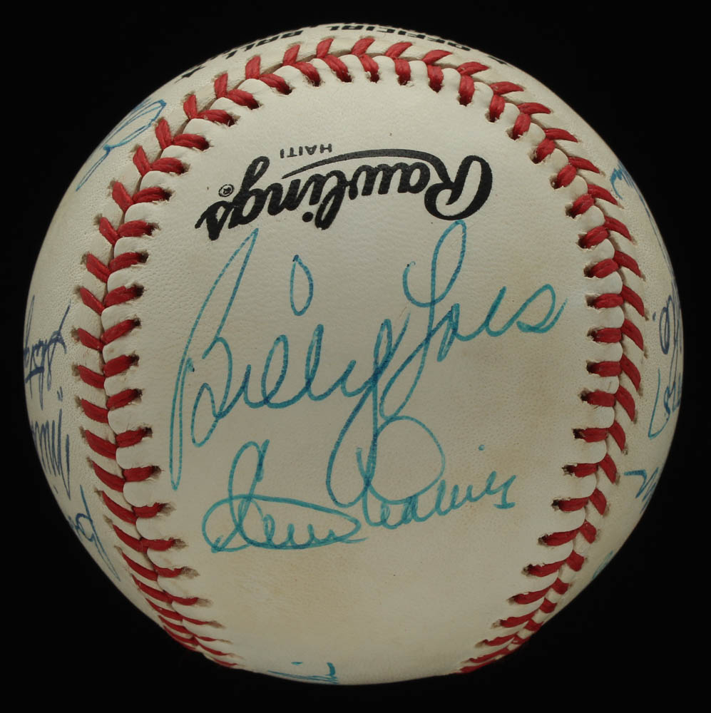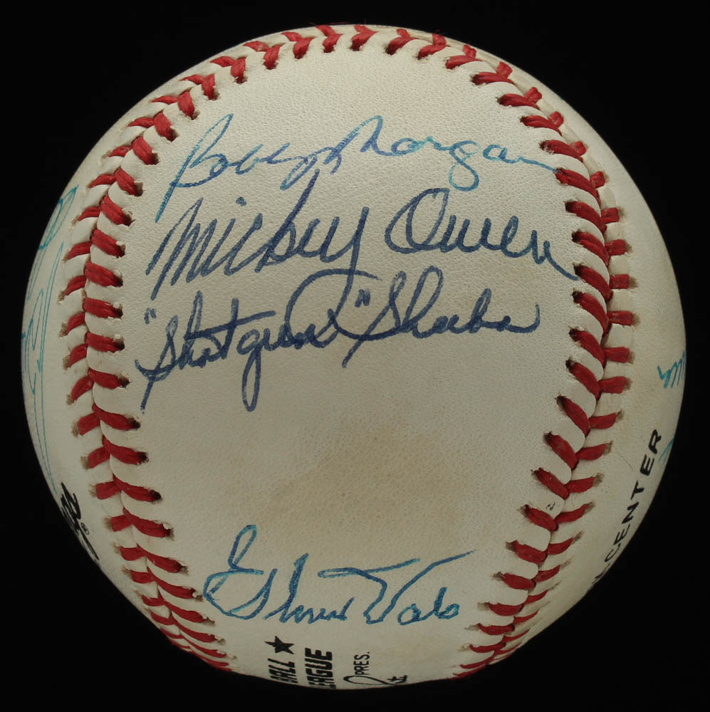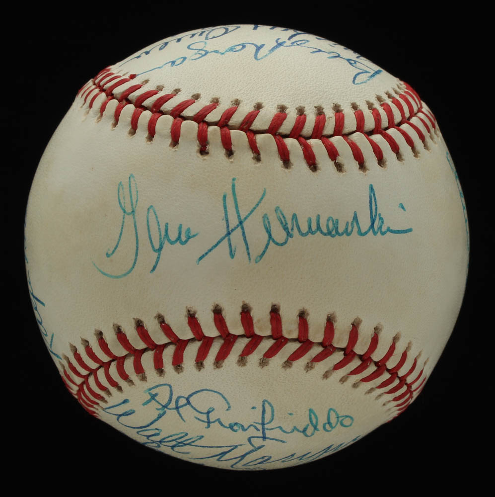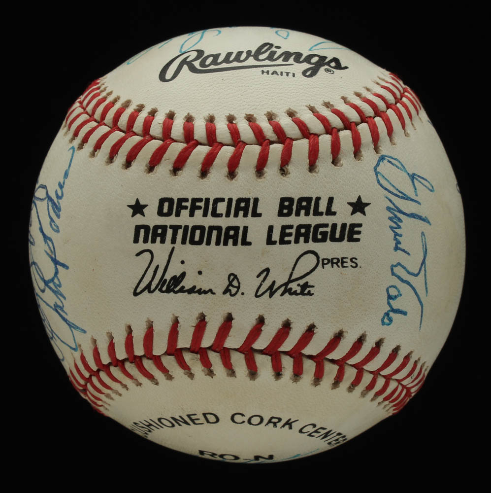 Rawlings Official National League baseball has been hand-signed by (14): with Andy Pafko (D. 2013, Brooklyn Dodgers), Johnny Podres (D. 2008), Gene Hermanski (D. 2010), Bobby Morgan, Mickey Owen (D. 2005), George Shuba (D. 2014), Al Gionfriddo (D. 2003), Walt Moryn (D. 1996), Sandy Amoros (D. 1992), Eddie Miksis (D. 2005), Ralph Branca (D. 2016), Billy Loes (D. 2010), Clem Labine (D. 2007), and Chris Van Cuyk (D. 1992). Please note, the baseball shows signs of natural toning.
