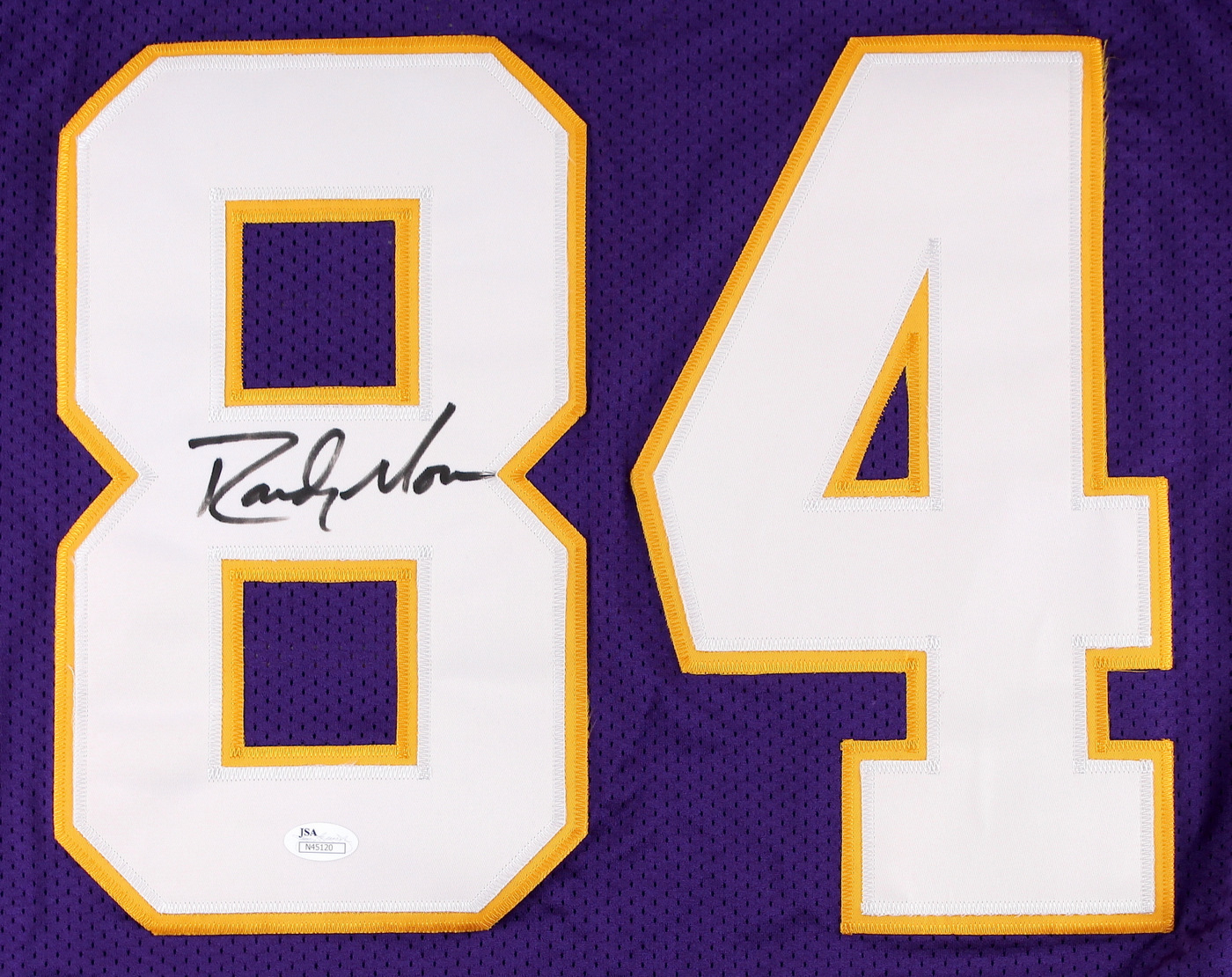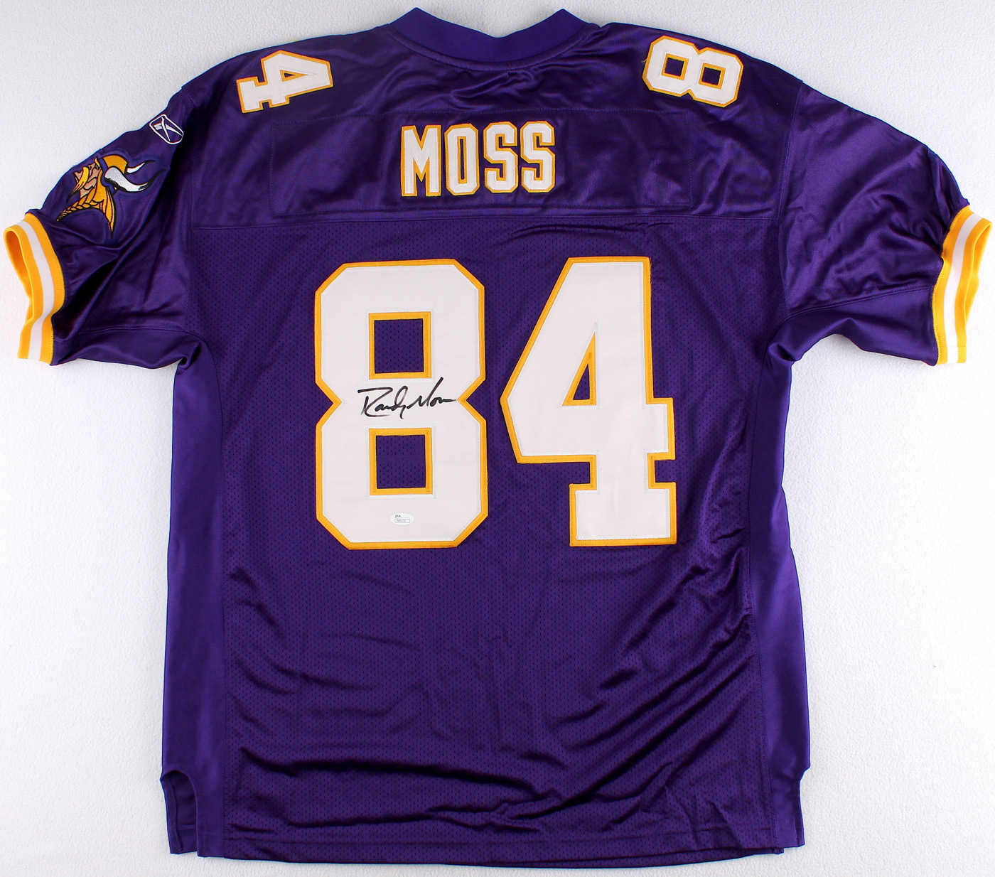 Reebok on-field style jersey. Everything is sewn on, size 52. Hand-signed in black felt tip pen by Randy Moss. The autograph includes an official James Spence Authentication (JSA) hologram and matching COA for authenticity purposes.