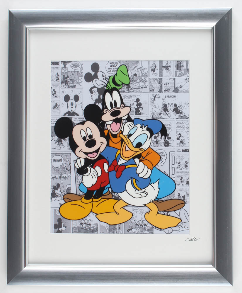 Custom frame measures 13 " x 16" in size and features a serigraph cel of Walt Disney's characters including: Mickey Mouse, Goofy, and Donald Duck.