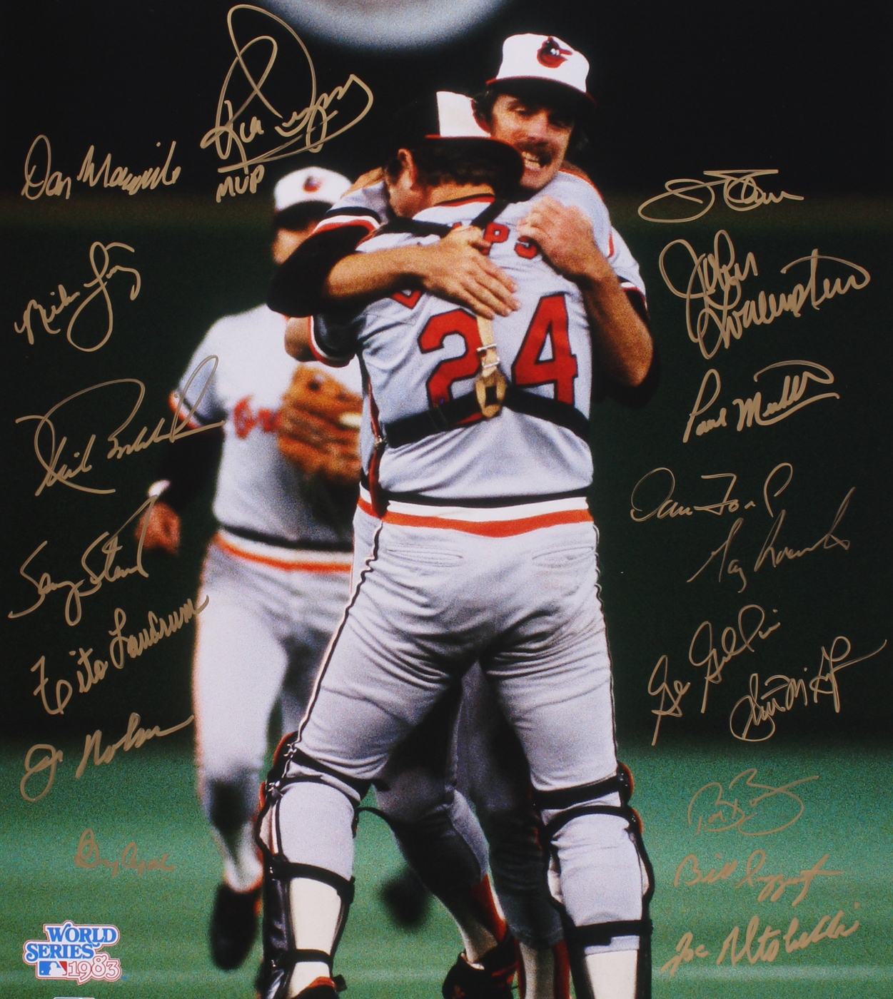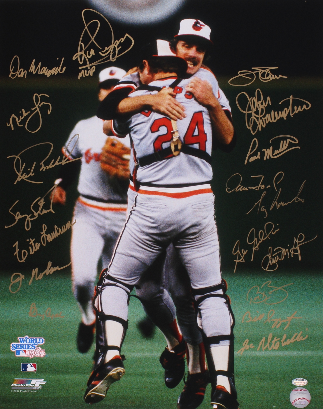Photo measures 16"x20" in size and has been hand-signed in gold paint pen by 18 members of the 1983 Orioles. The autographs include Jim Palmer, Scott McGregor, Rick Dempsey, Paul Mirabella, Joe Nolan, Tito Landrum, Dan Morogiello, Benny Ayala and others. The autograph includes an official Schwartz Sports Hologram and matching COA for authenticity purposes.