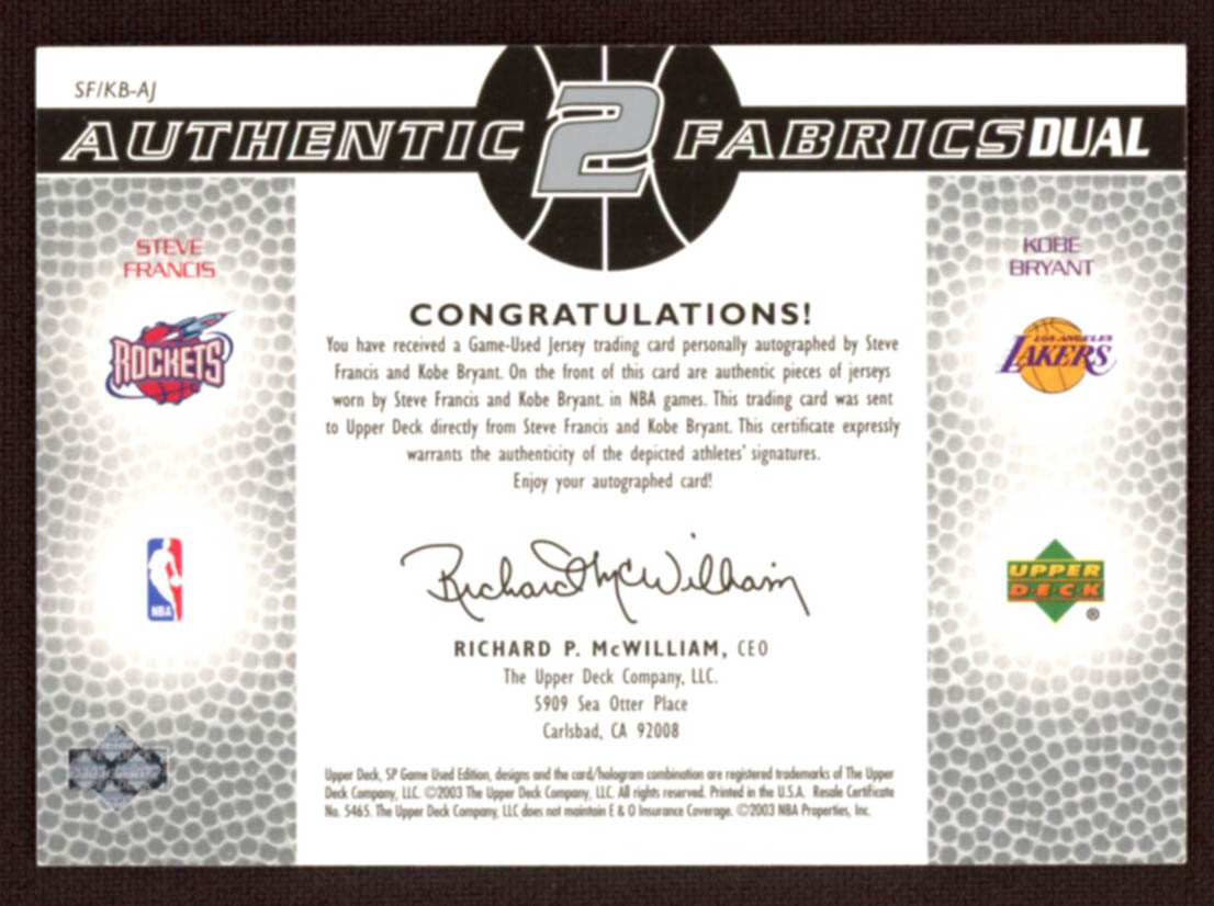 Steve Francis / Kobe Bryant 2003-04 SP Game Used Authentic Fabrics Dual Autographs #35
