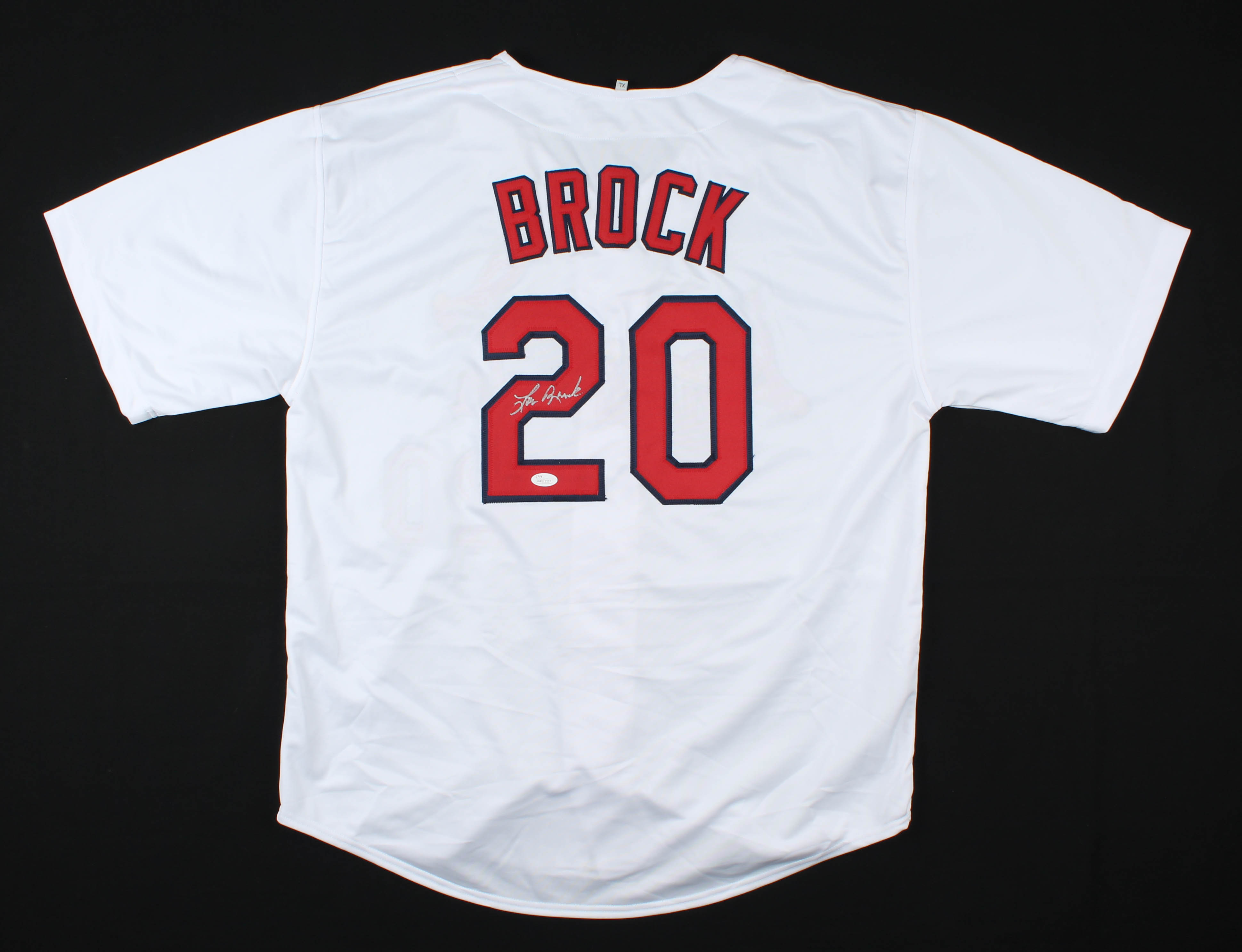 Custom on-field style jersey. Everything is sewn on, size XL. Hand-signed by Lou Brock (D. 2020, HOF).