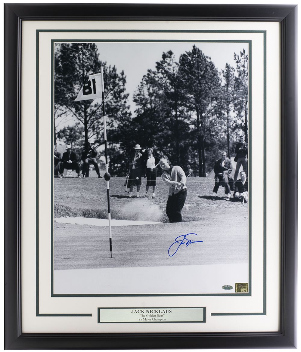 Custom frame measures approximately 22" x 27" in size and features a photo that has been hand-signed by Jack Nicklaus (HOF).