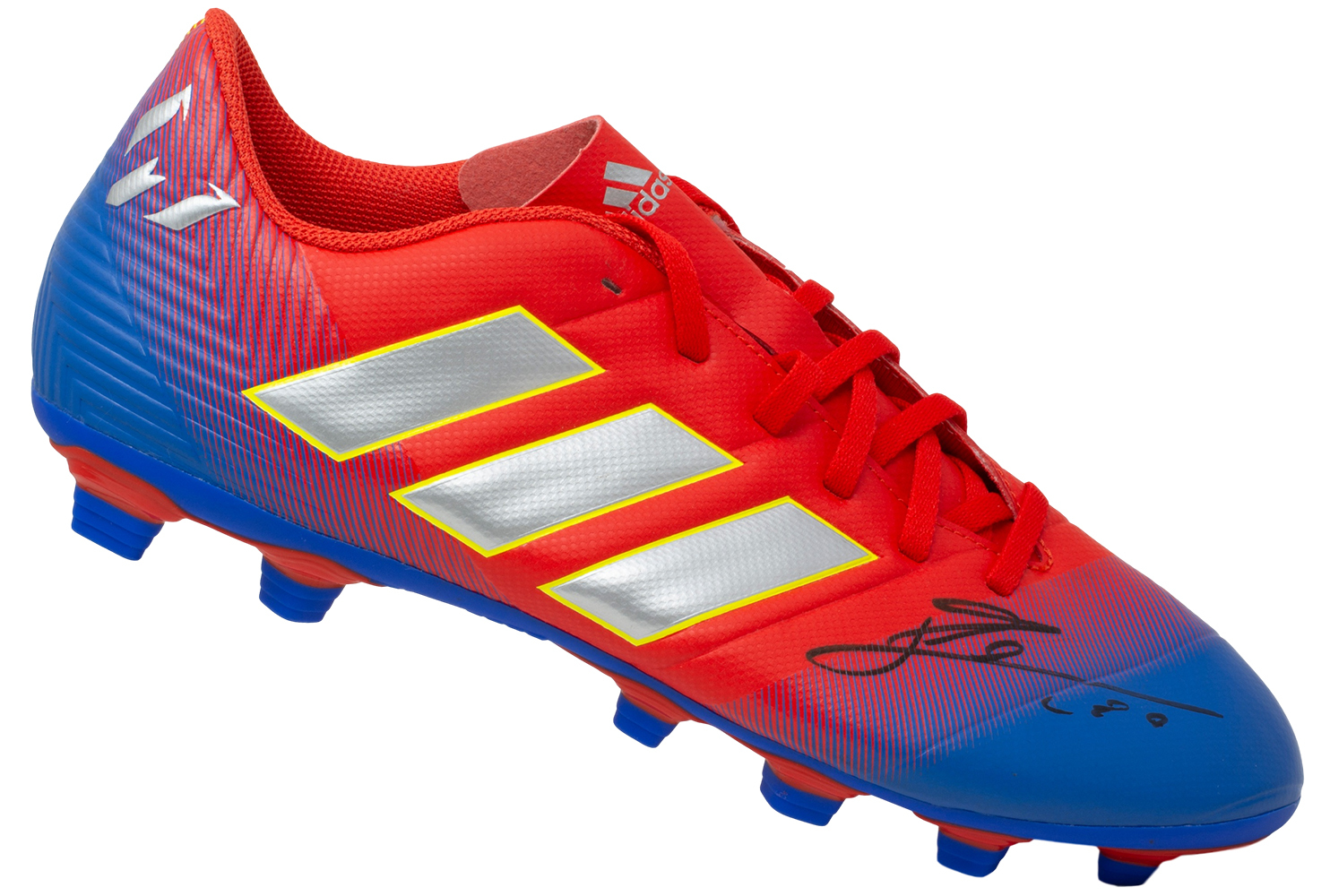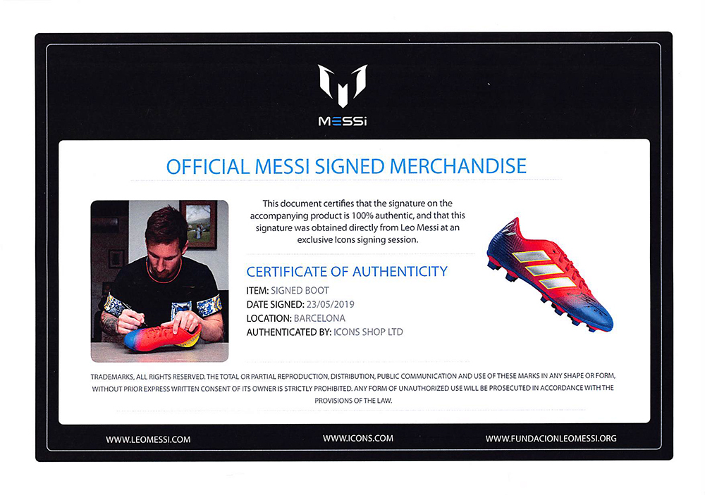 Adidas soccer cleat. Hand-signed by Lionel Messi (Barcelona FC).