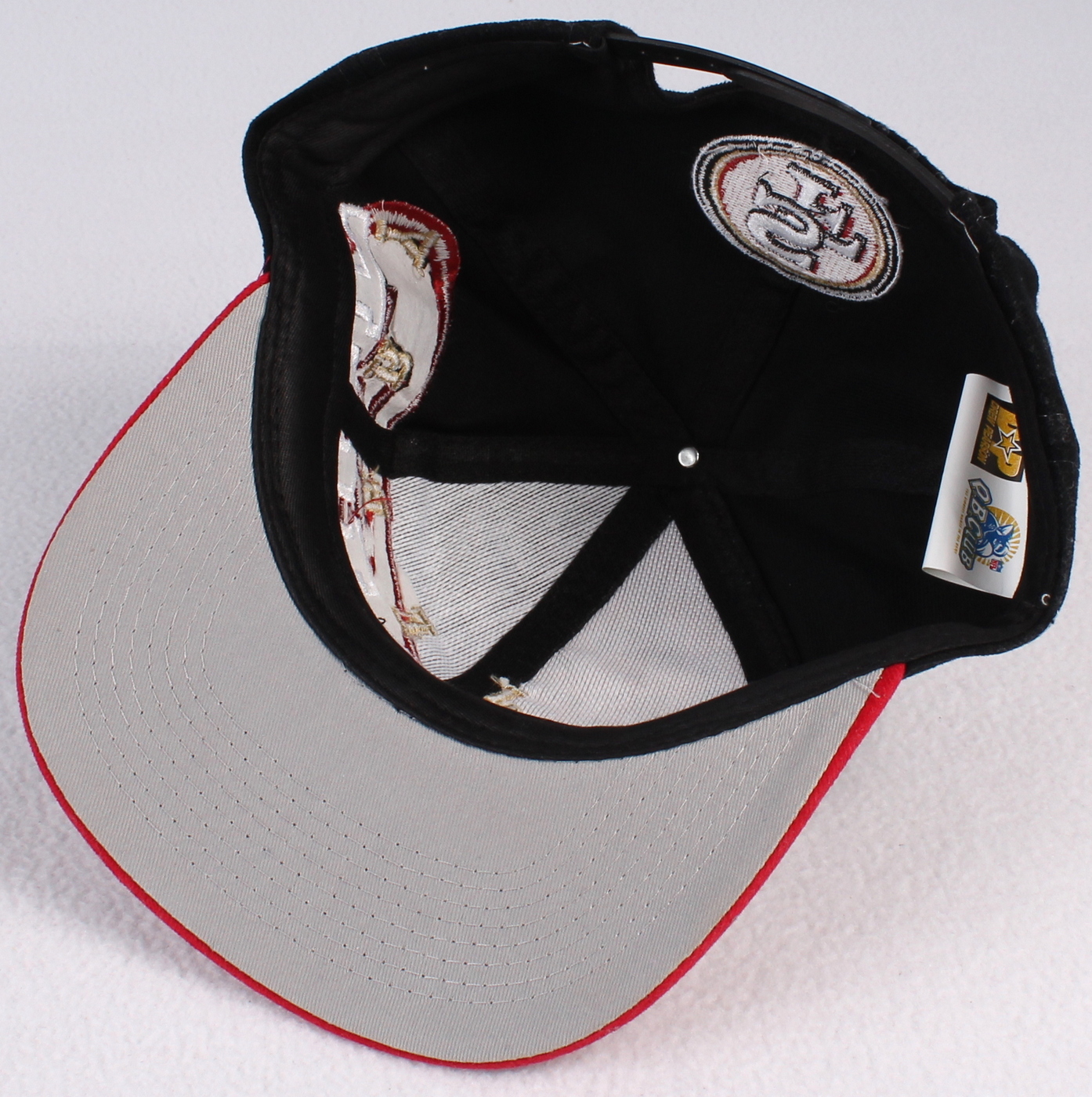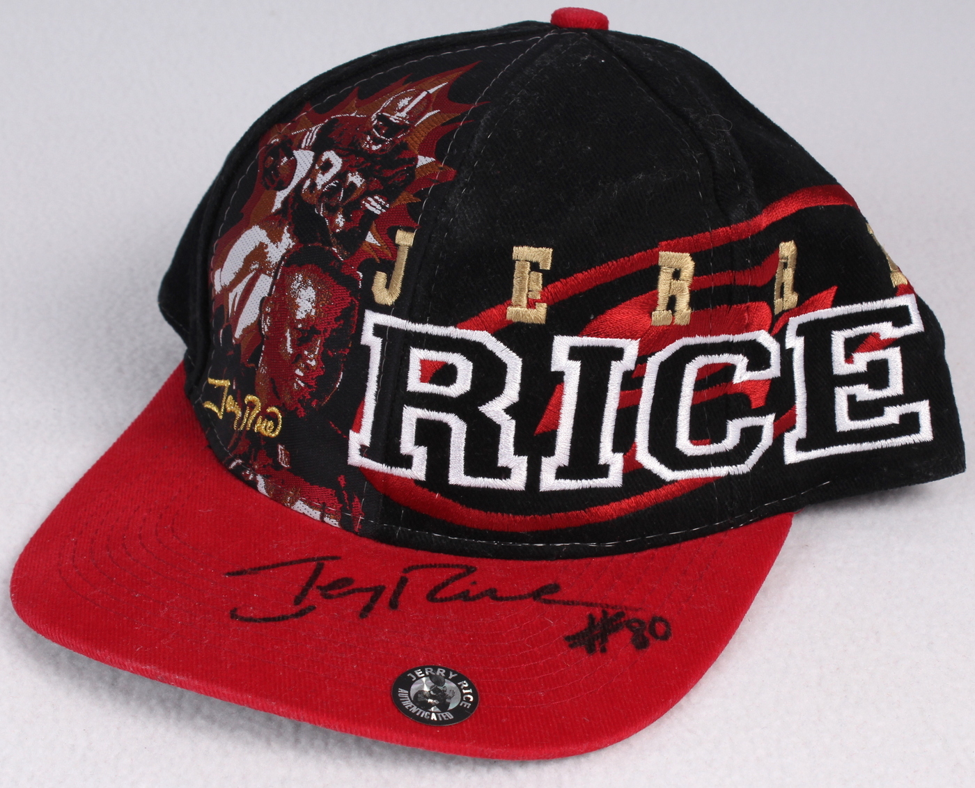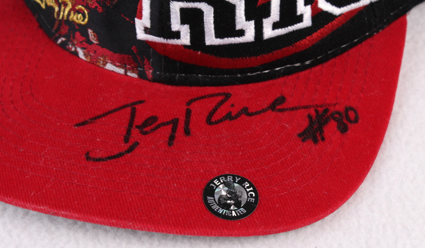 Custom stitched 49ers snap-back hat. Hand-signed in black felt-tip pen by Jerry Rice (49ers, HOF). The autograph includes an official Jerry Rice hologram for authenticity purposes.