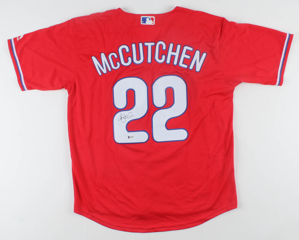 Majestic on-field style jersey. Everything sewn on, size XL. Hand-signed by Andrew McCutchen (Philadelphia Phillies).