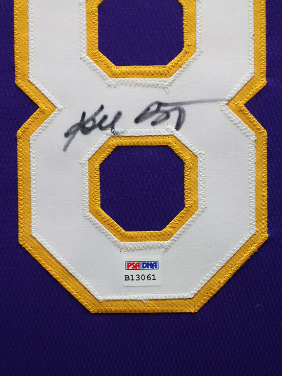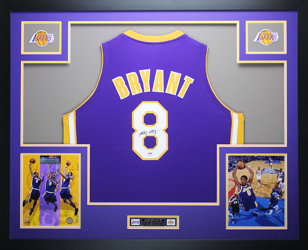 A beautifully framed autographed Kobe Bryant Lakers Jersey. The autograph is certified by PSA and includes a sticker on the Jersey and a matching certificate attached to the back of the frame.