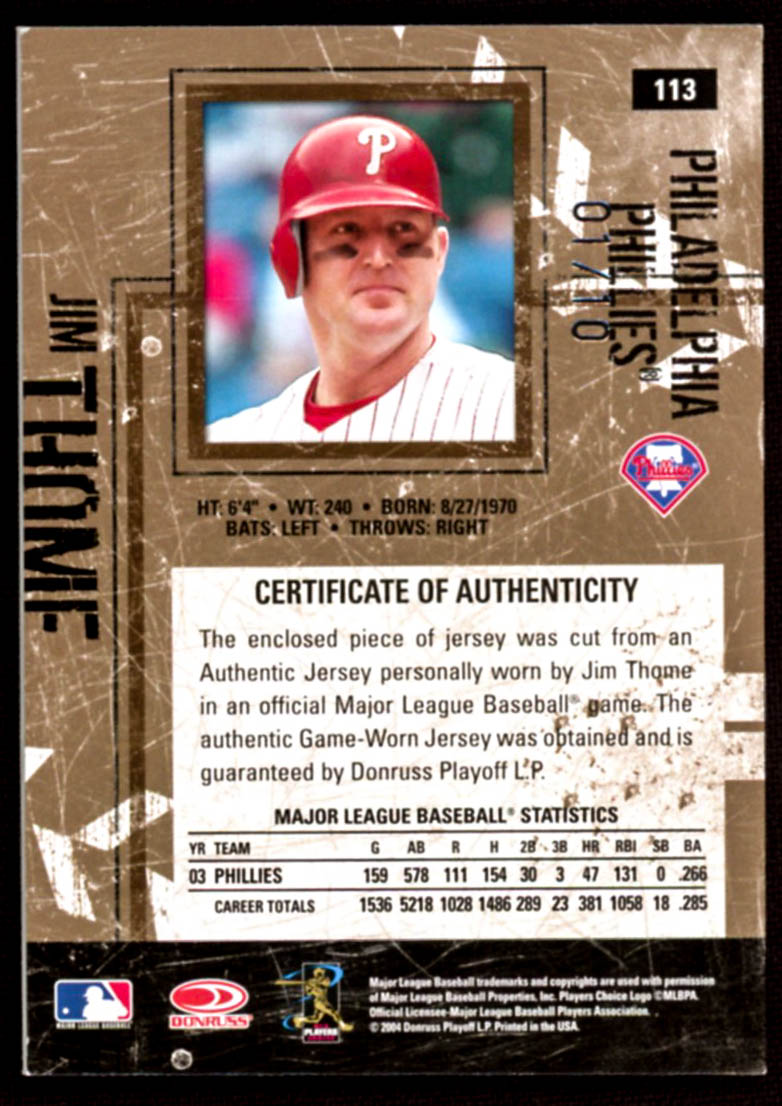 Jim Thome 2004 Leather and Lumber Materials Jersey Prime #113