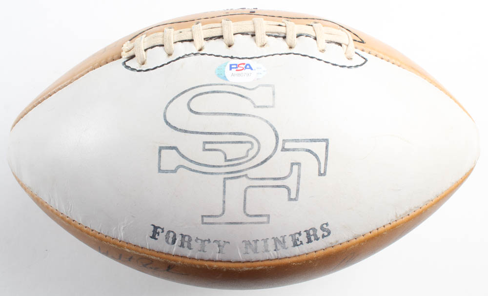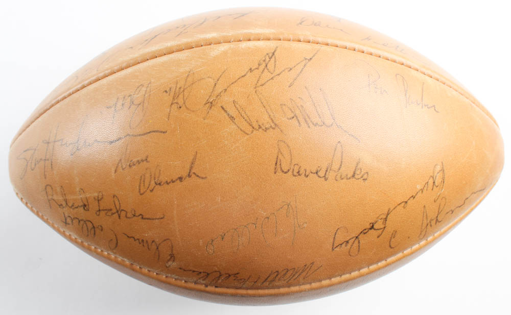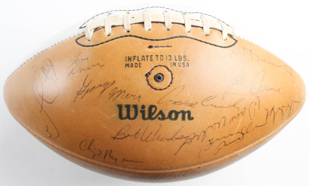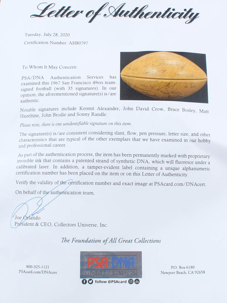 1967 San Francisco 49ers logo football has been hand-signed by (35) with John Brodie, Charlie Krueger, Kermit Alexander, Ed Beard, Joe Cerne, Elmer Collett, John David Crow, Doug Cunningham, Tommy Davis, George Donnelly, Bob Harrison, Matt Hazeltine, Dave Hettema, Stan Hindman, Charlie Johnson, David Kopay, Roland Lakes, Clark Miller, George Mira, Howard Mudd, Chip Myers, Frank Nunley, Dave Olerich, Don Parker, Dave Parks, and (10) others. Please note, the football does not hold air.