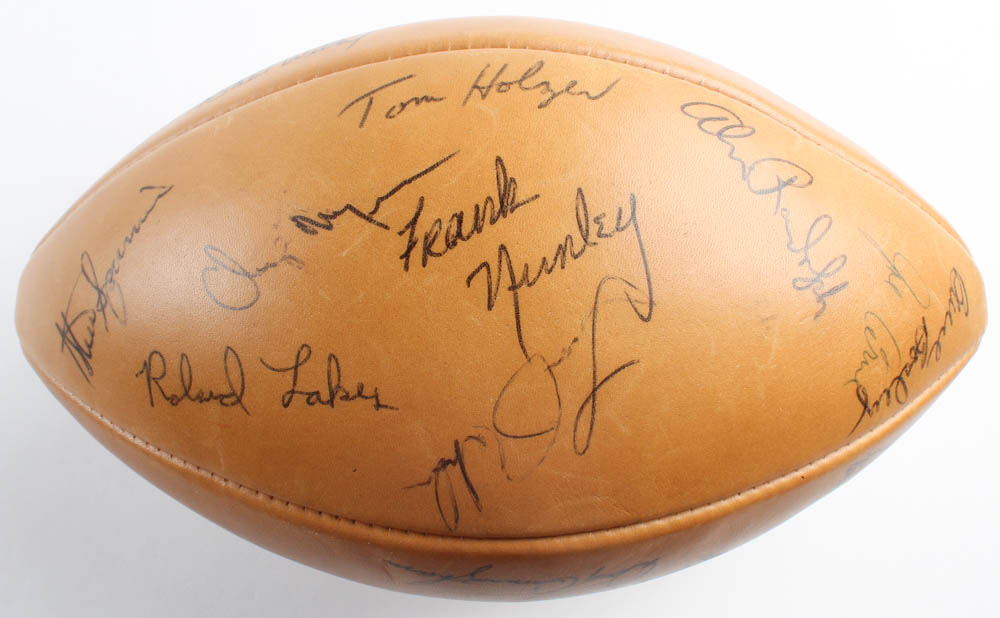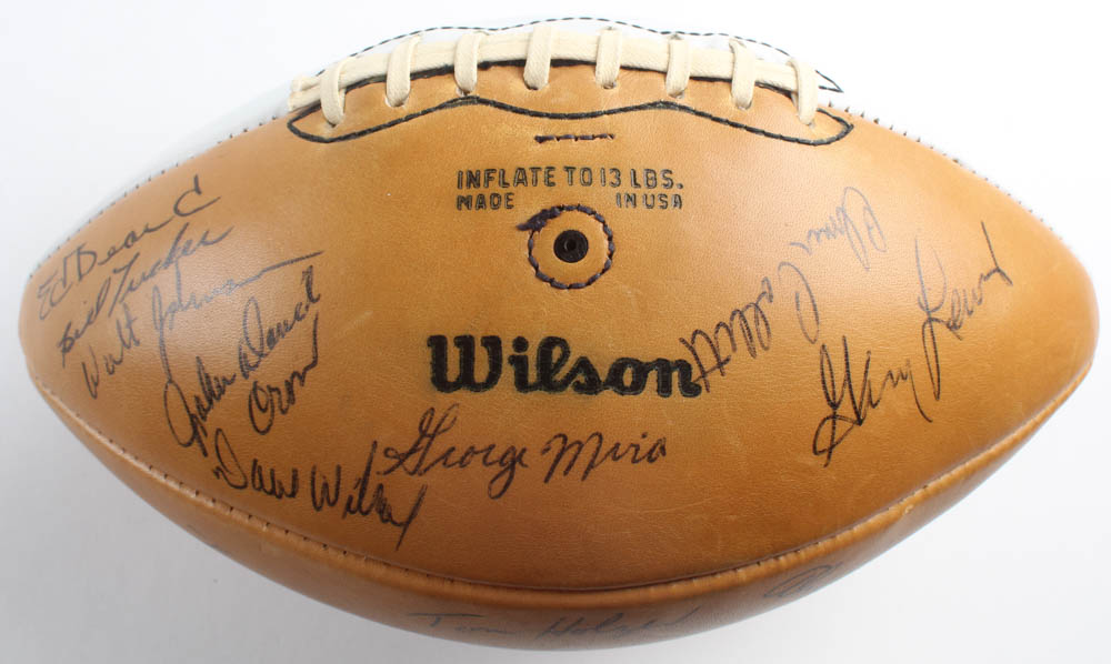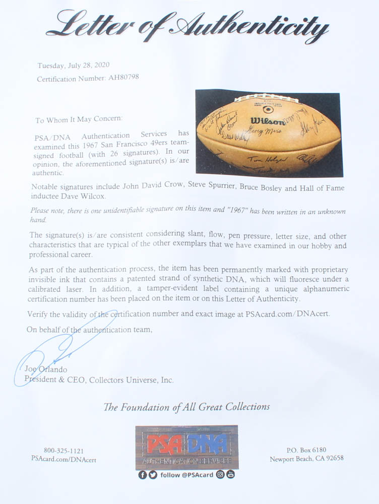 1967 San Francisco 49ers logo football has been hand-signed by (26) with Bruce Bosley, Charlie Krueger, Monty Stickles, Ed Beard, Joe Cerne, Elmer Collett, John David Crow, Doug Cunningham, Bob Harrison, Tom Holzer, Walter Johnson, David Kopay, Roland Lakes, Garry Lewis, Clark Miller, and (11) others. Please note, the football does not hold air. Please see images for details regarding the condition of the ball.