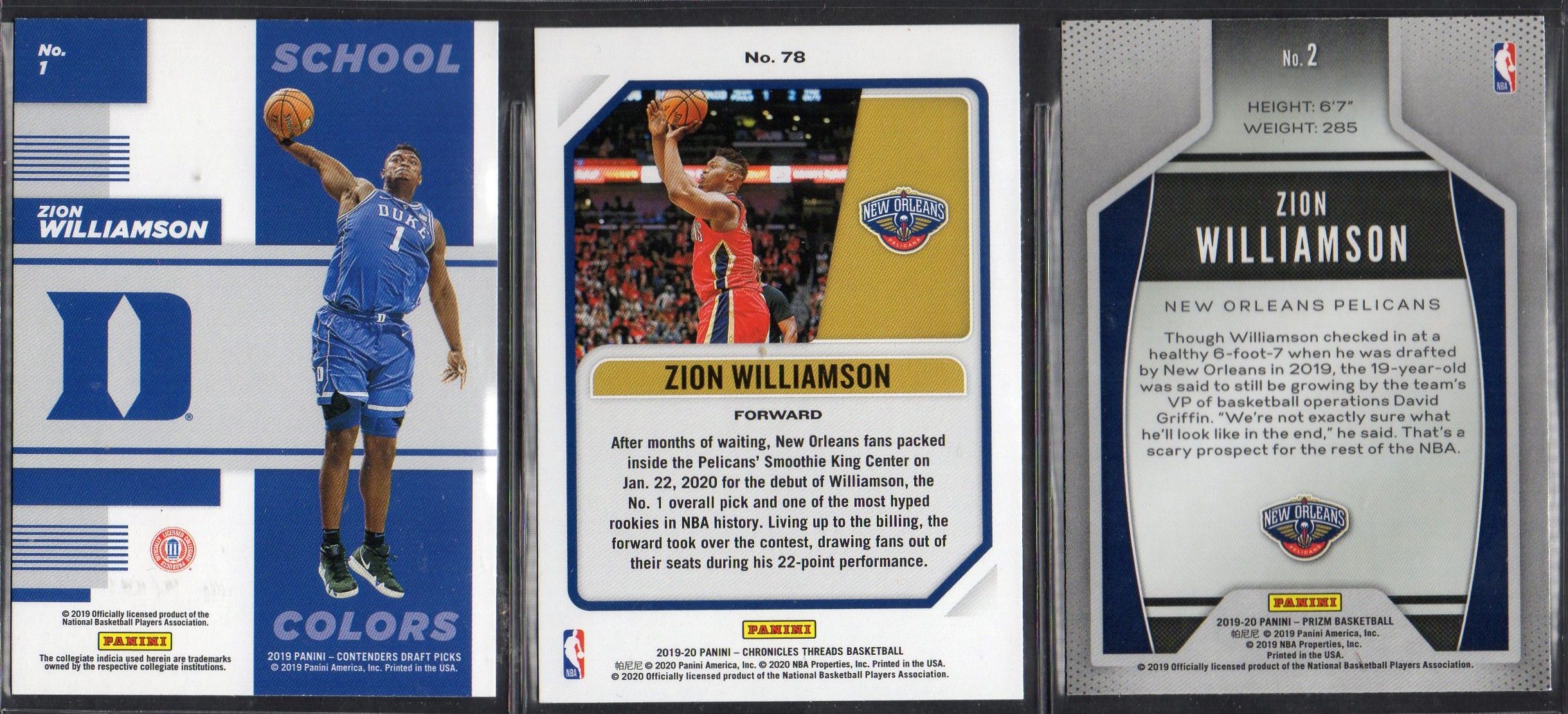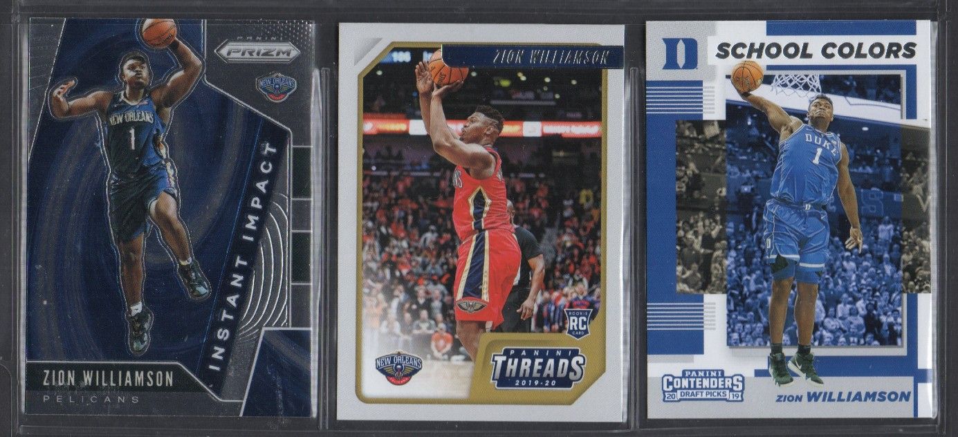Lot of (3) Zion Williamson Basketball Cards with 2019-20 Panini Prizm Instant Impact #2, 2019-20 Panini Chronicles #78 / Threads RC & 2019-20 Panini Contenders Draft Picks School Colors #1