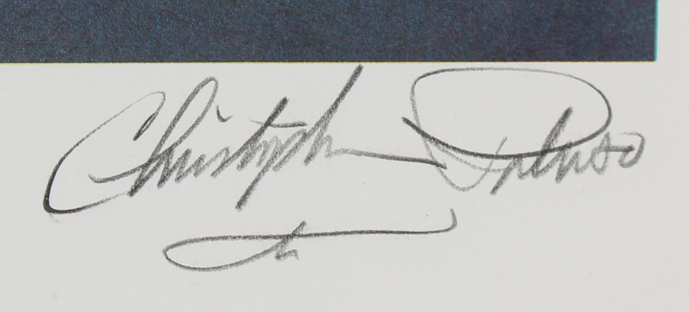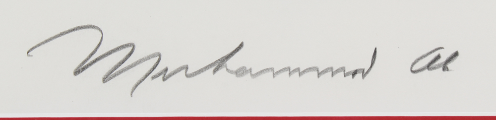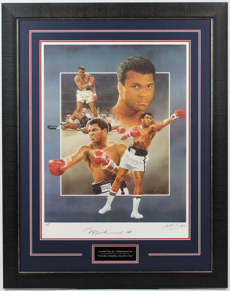 Custom frame measures approximately 26.5" x 33.75" in size and features a lithograph that has been hand-signed by Muhammad Ali (D. 2016, HOF) and the artist, Christopher Paluso. Please see photos for details regarding the condition of the frame.