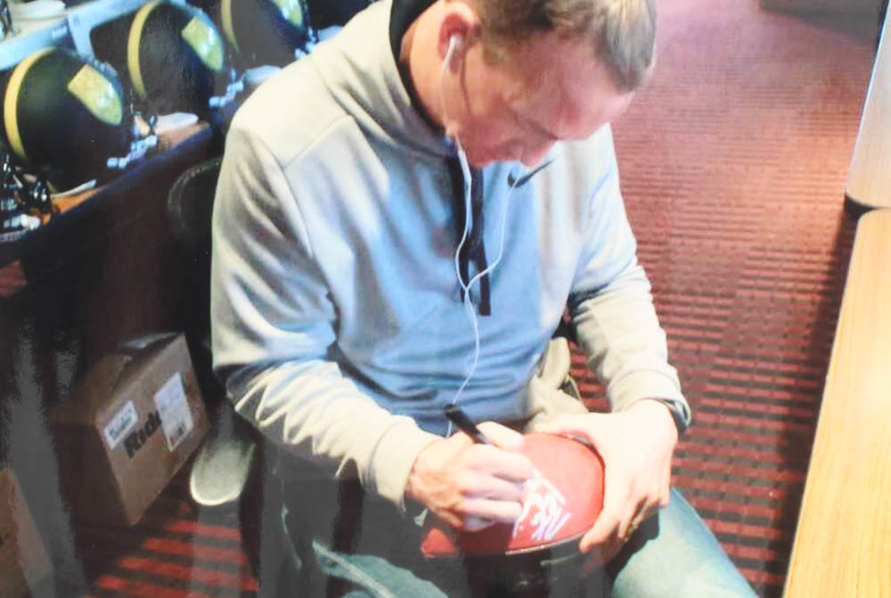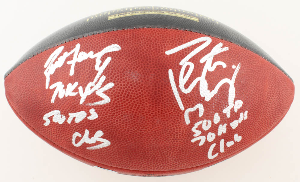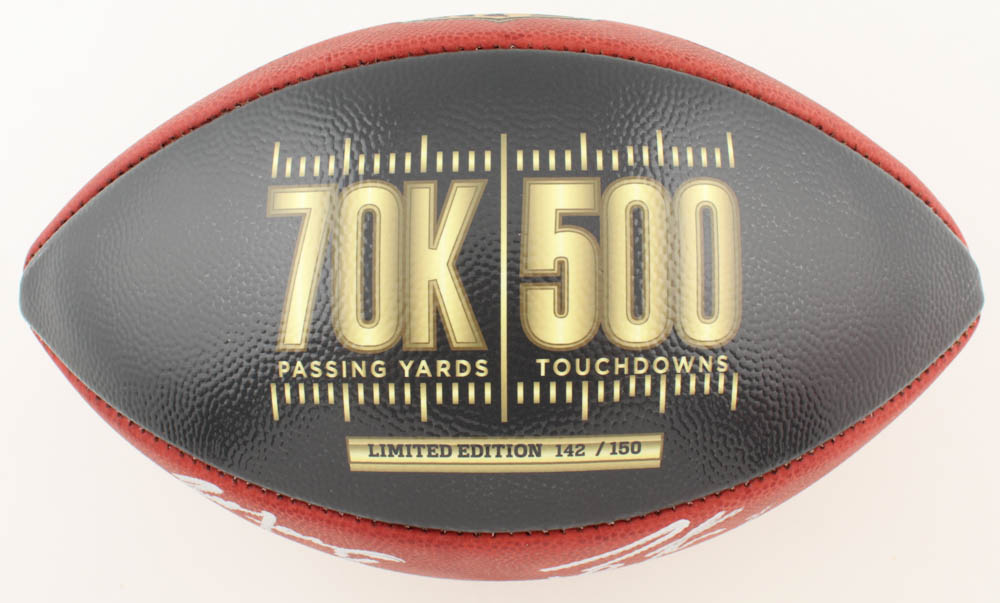 Wilson "70K Passing Yards & 500 Passing Touchdowns Club" official NFL "The Duke" game football. Hand-signed and inscribed by Brett Favre (Green Bay Packers, HOF) and Peyton Manning (Indianapolis Colts). Football is limited edition # 142 / 150.