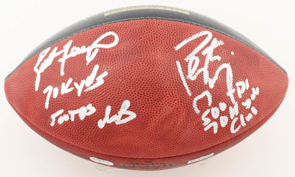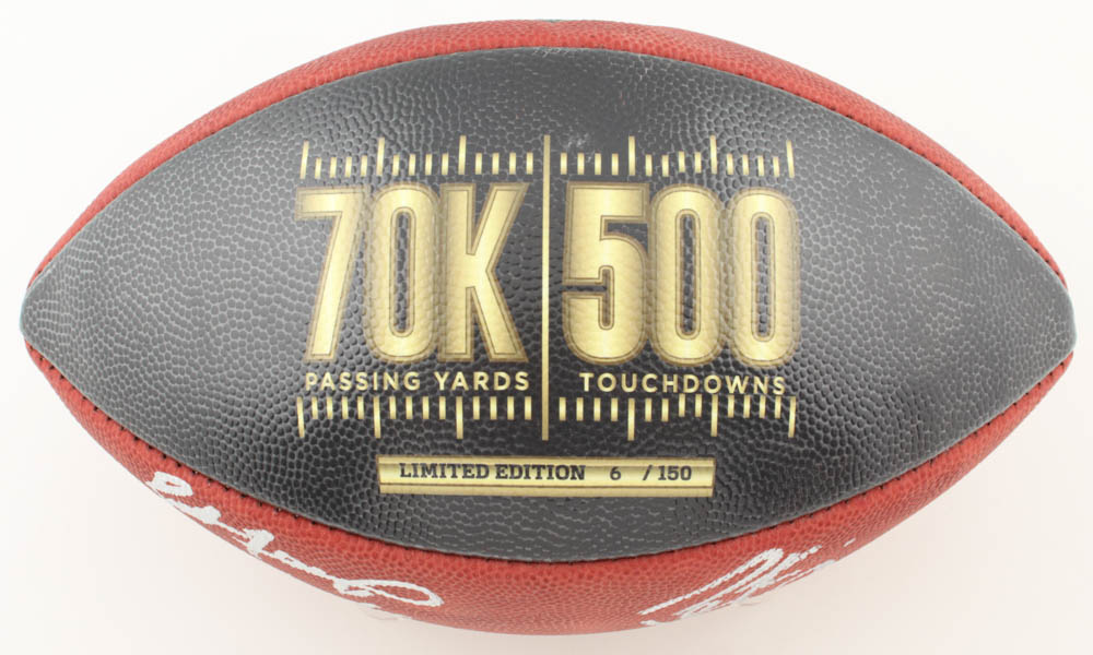 Wilson "70K Passing Yards & 500 Passing Touchdowns Club" official NFL "The Duke" game football. Hand-signed and inscribed by Brett Favre (Green Bay Packers, HOF) and Peyton Manning (Indianapolis Colts). Football is limited edition # 6 / 150.