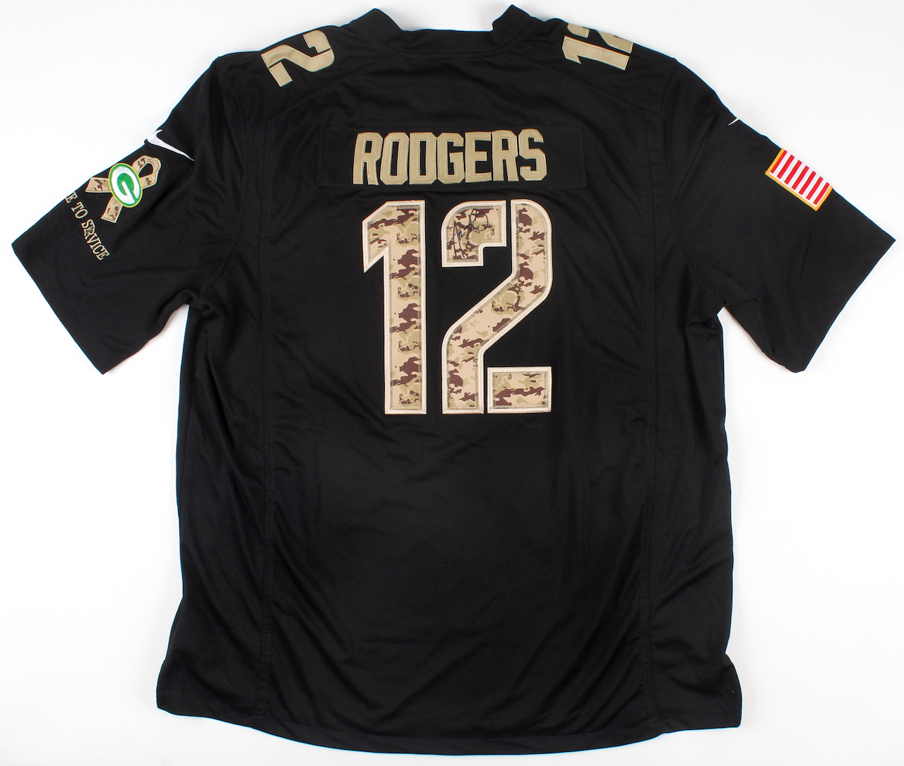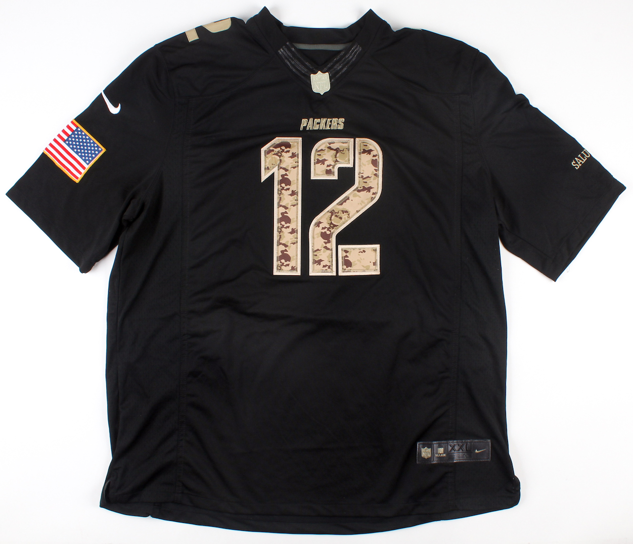 Nike on-field style Salute to Service Jersey. Everything sewn on, size XXL. Hand-signed by Aaron Rodgers (Green Bay Packers).