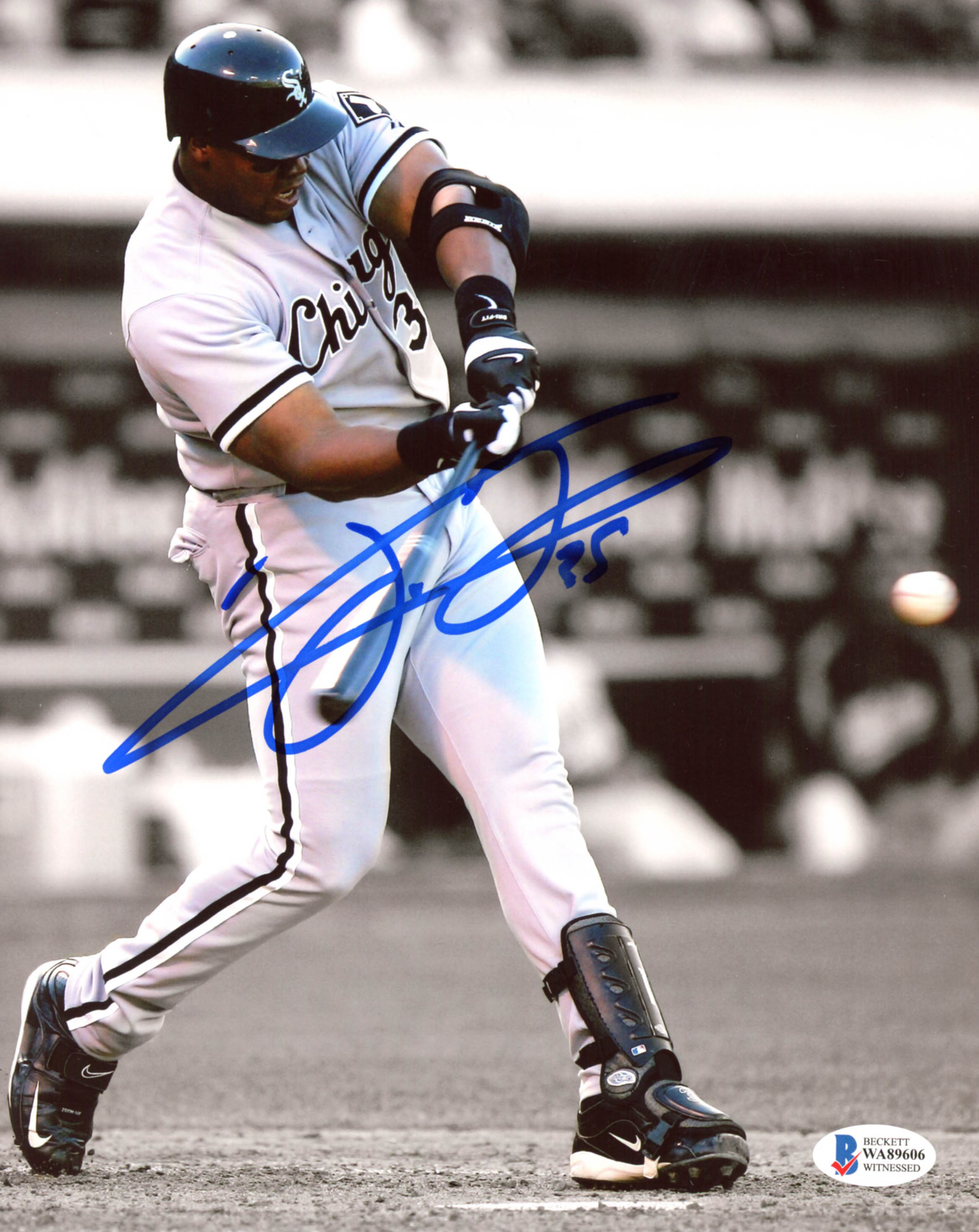 Photo measures 8" x 10" in size and has been hand signed by Frank Thomas (Chicago White Sox, HOF)