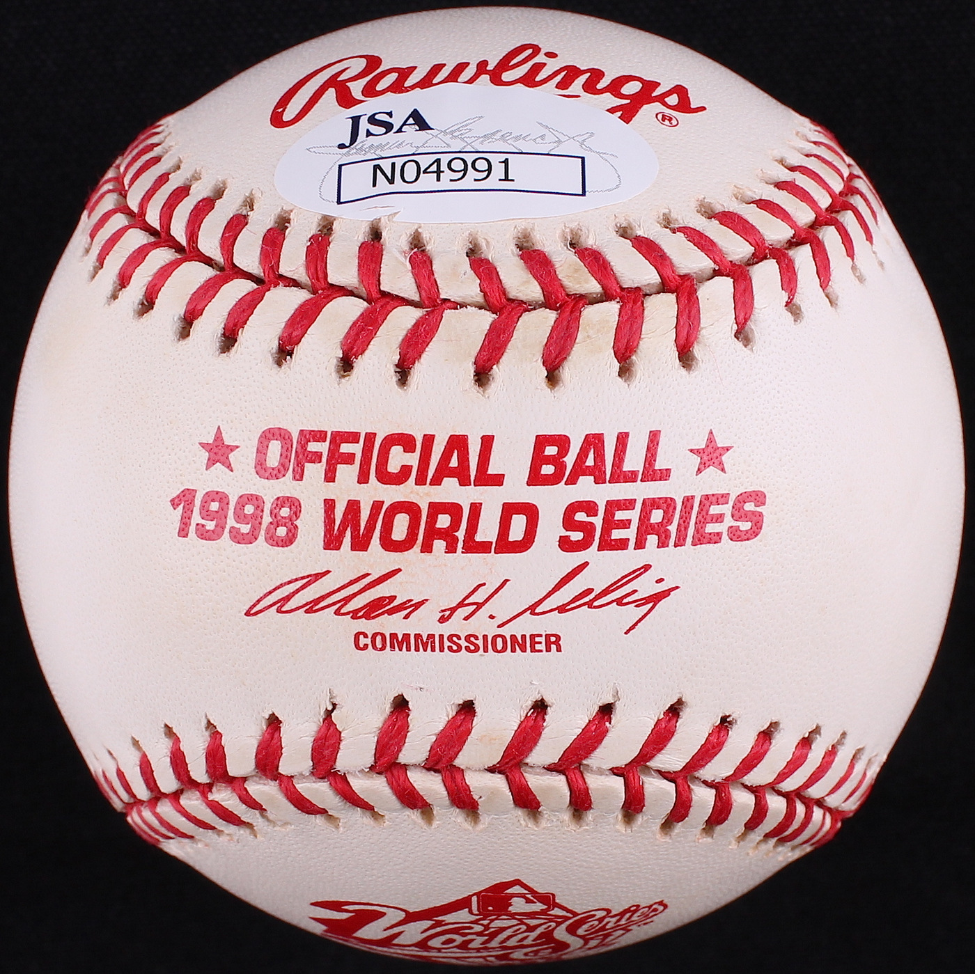 Official 1998 World Series Baseball. Hand-signed and inscribed in blue ink pen by Scott Brosius (Yankees). The autograph includes an official James Spence Authentication (JSA) hologram and matching COA for authenticity purposes.