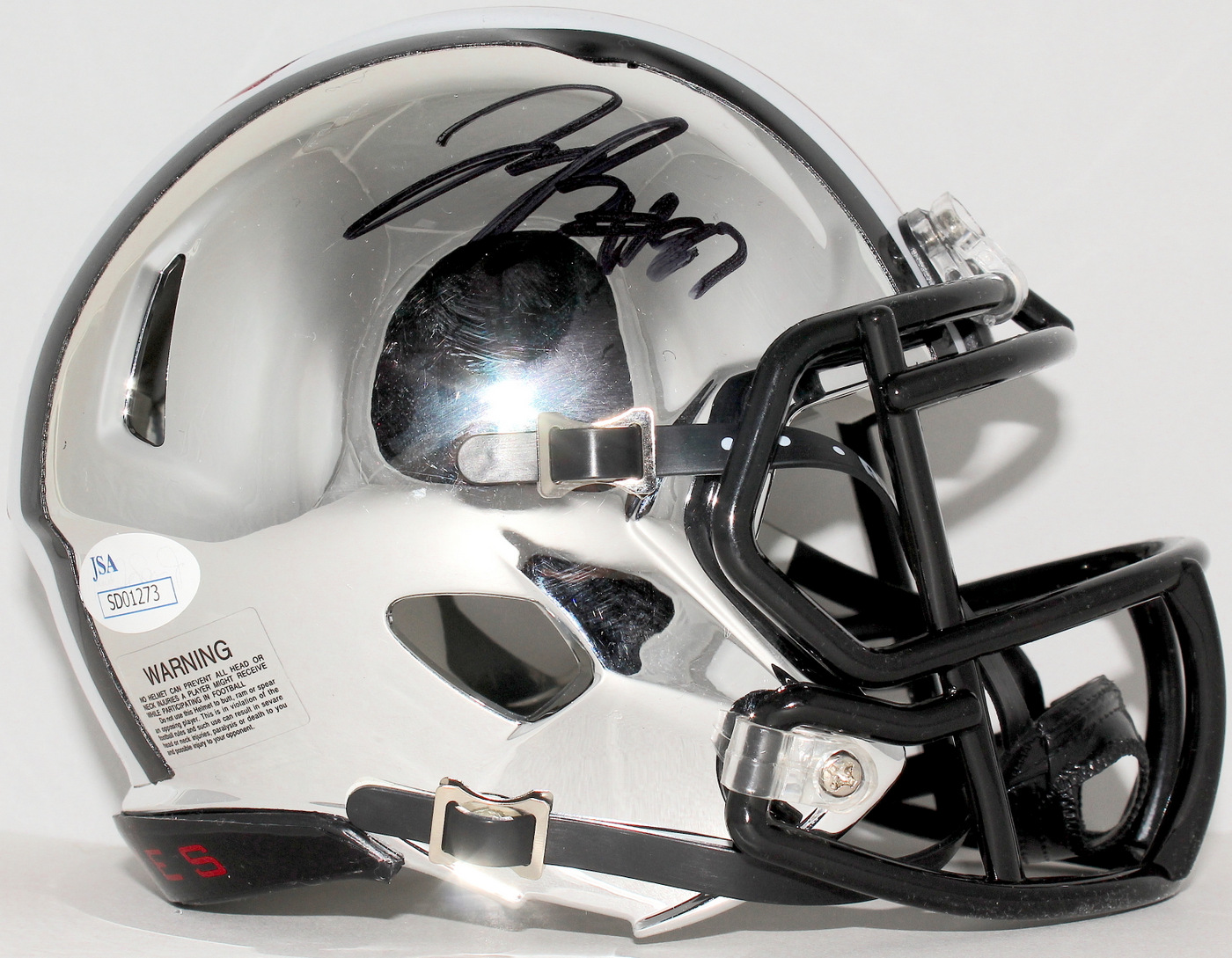 Riddell Mini-Helmet. Hand-signed in black felt tip pen by Joey Bosa. The autograph includes an official James Spence Authentication (JSA) "Signature Debut" hologram and COA. "Signature Debut" is the autographed memorabilia equivalent to a rookie card. The JSA definition of a "Signature Debut" is as follows: "Any item that is autographed and received by JSA prior to the last game of the signer's official rookie season.