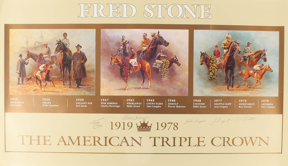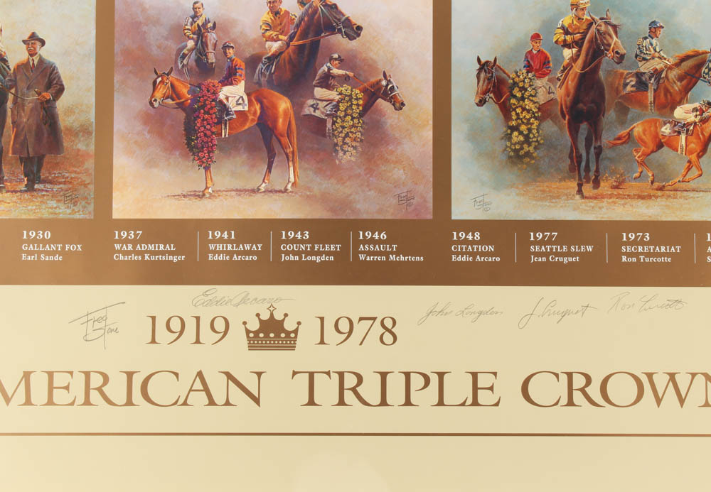 American Triple Crown Winners 21x35.5 Print Signed by (5) with Eddie Arcaro, Fred Stone, John Longden, Ron Turcotte & Jean Cruquet (JSA COA)