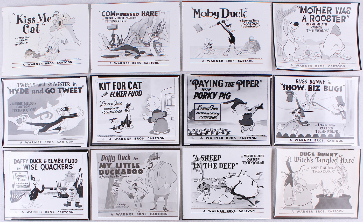 Lot includes (12) Vintage Warner Bros. Looney Tunes Lobby Cards, each one measuring 8" x 10". Studio lobby card publicity stills were used to promote the cartoon short being shown in the theatre. Often seen behind a glass window near the box office, these publicity stills are excellent mementos and collectibles from the cartoon.