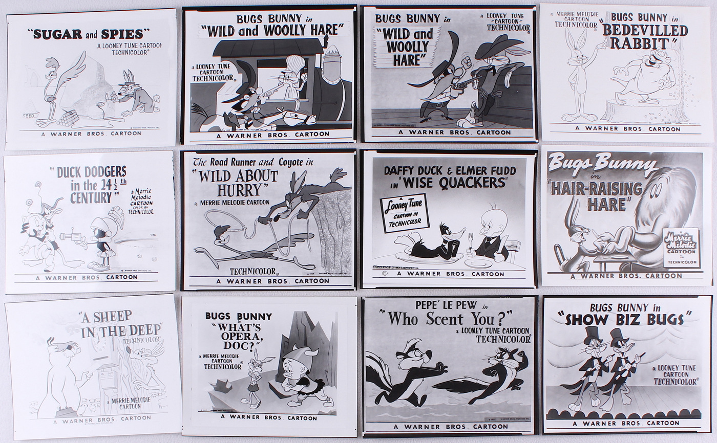 Lot includes (12) Vintage Warner Bros. Looney Tunes Lobby Cards, each one measuring 8" x 10". Studio lobby card publicity stills were used to promote the cartoon short being shown in the theatre. Often seen behind a glass window near the box office, these publicity stills are excellent mementos and collectibles from the cartoon.