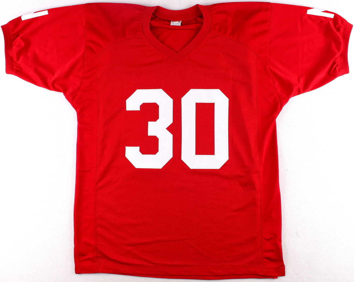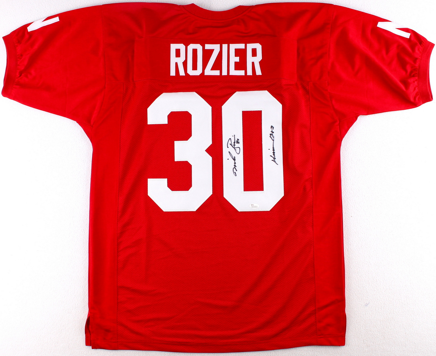 Custom on-field style jersey. Everything is sewn on, size XL. Hand-signed and inscribed in black felt-tip pen by Mike Rozier. The autograph includes an official James Spence Authentication (JSA) hologram and matching COA for authenticity purposes. The signing of this item was witnessed by JSA.